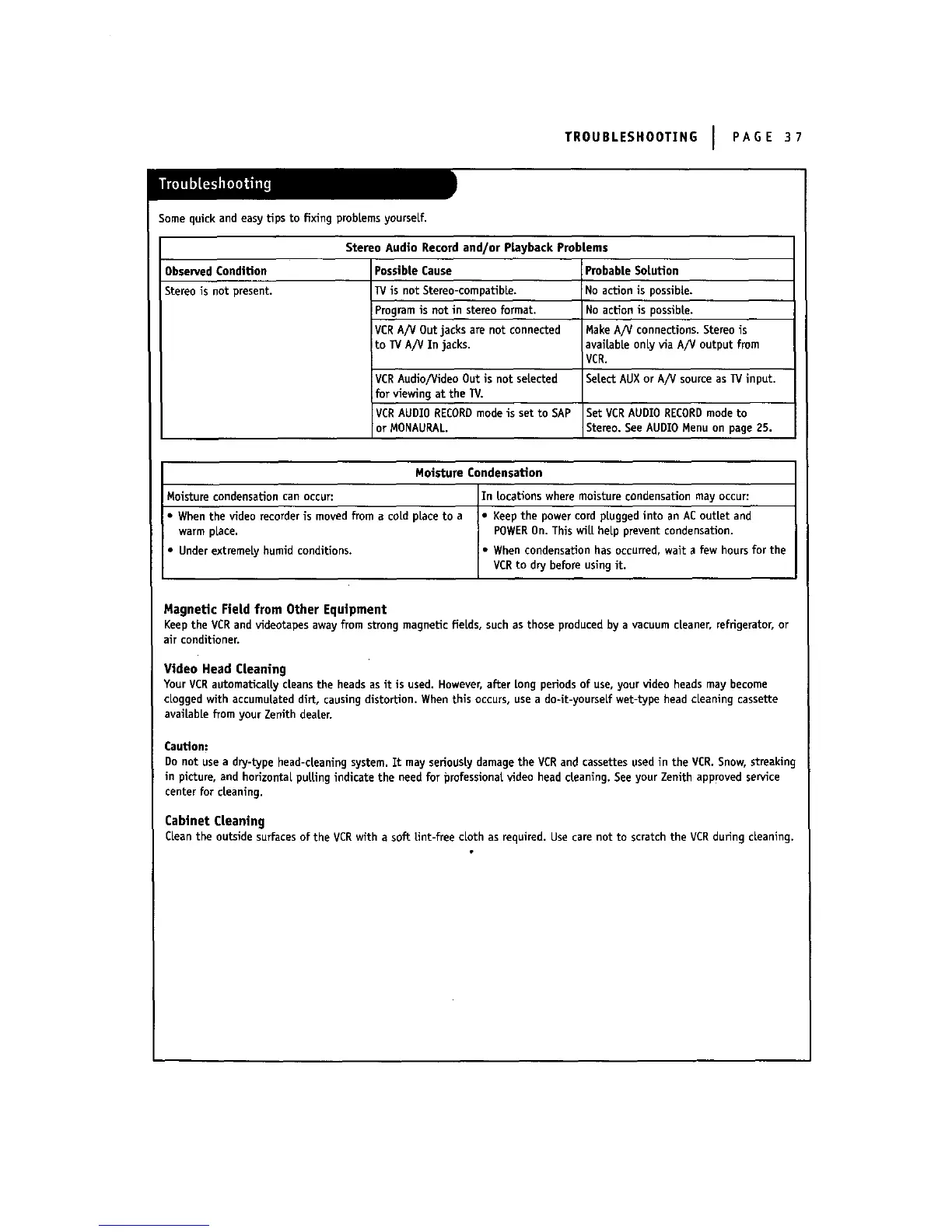 in picture, and horizontal pulling indicate the need for professfonal video head cleaning. See your Zenith approved service