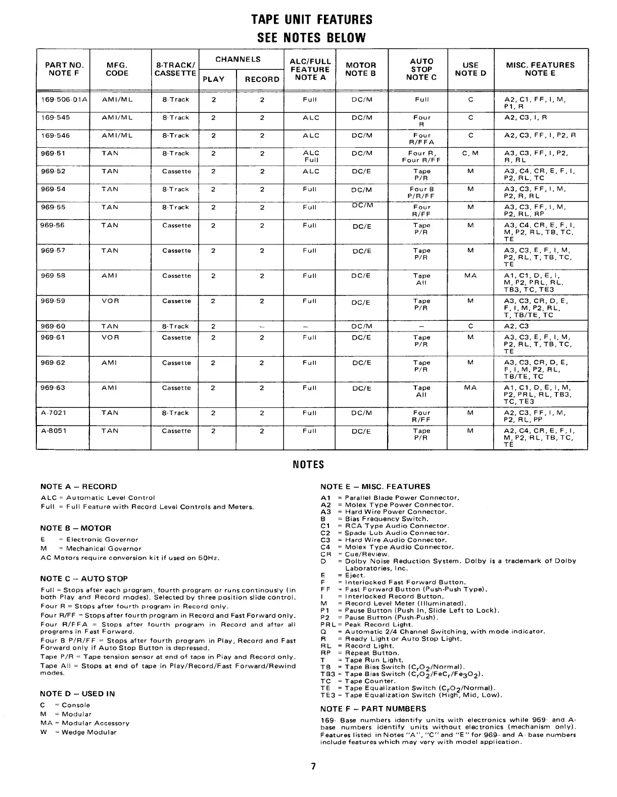 Features listed in Notes "A", "C" and "E" for 969- and A- base numbers