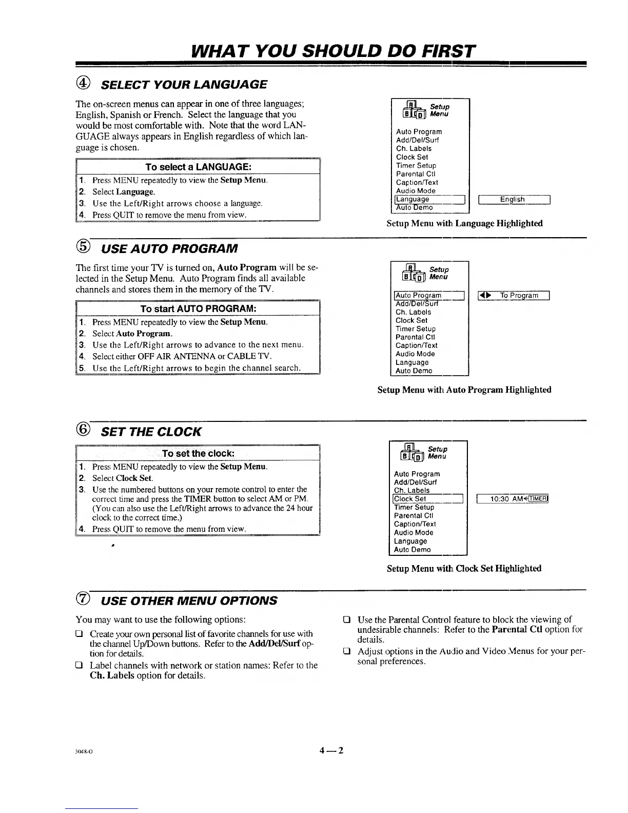 1. Press MENU repeatedly to view the Setup Menu.
