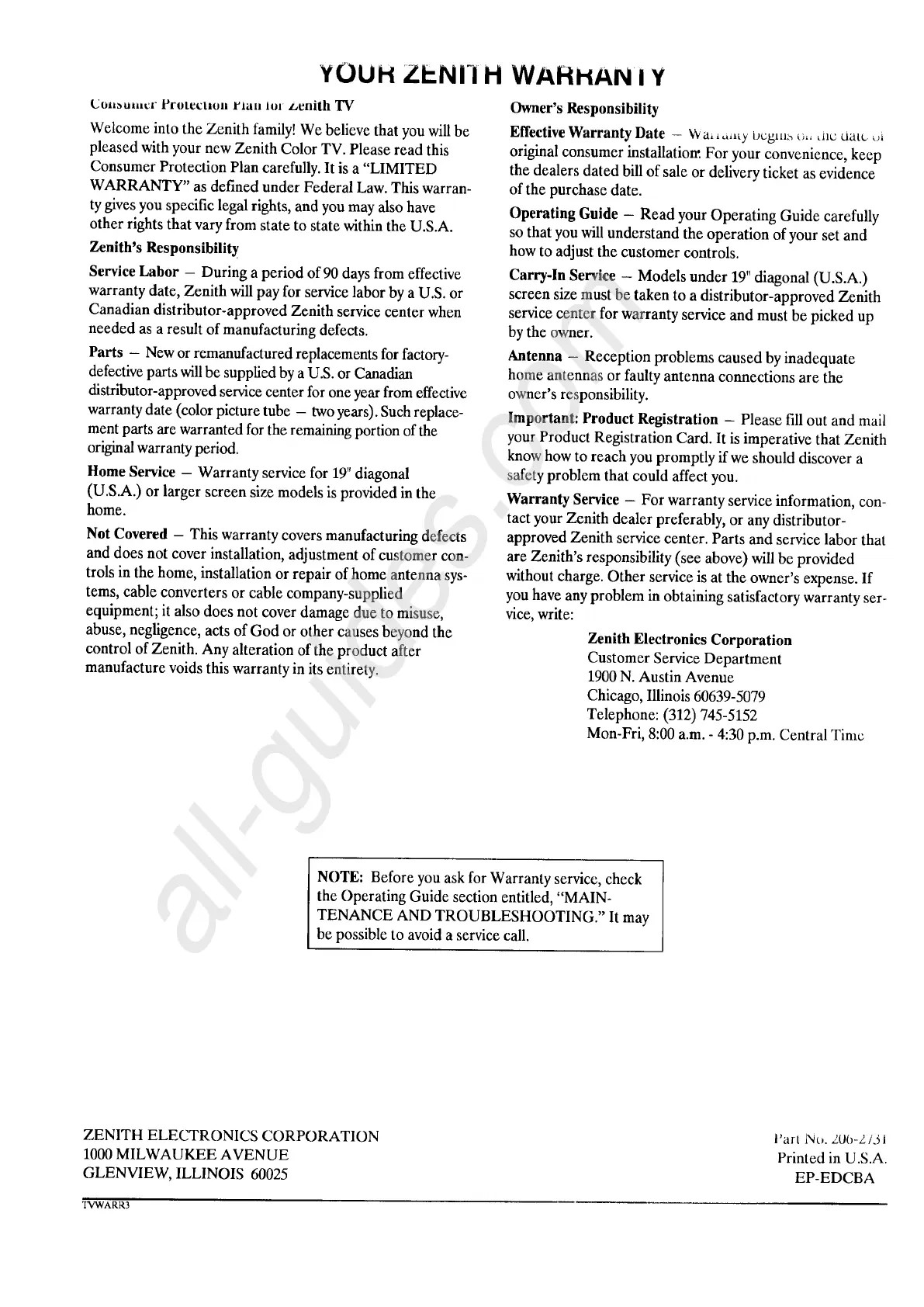 approved Zenith service center. Parts and service labor that
