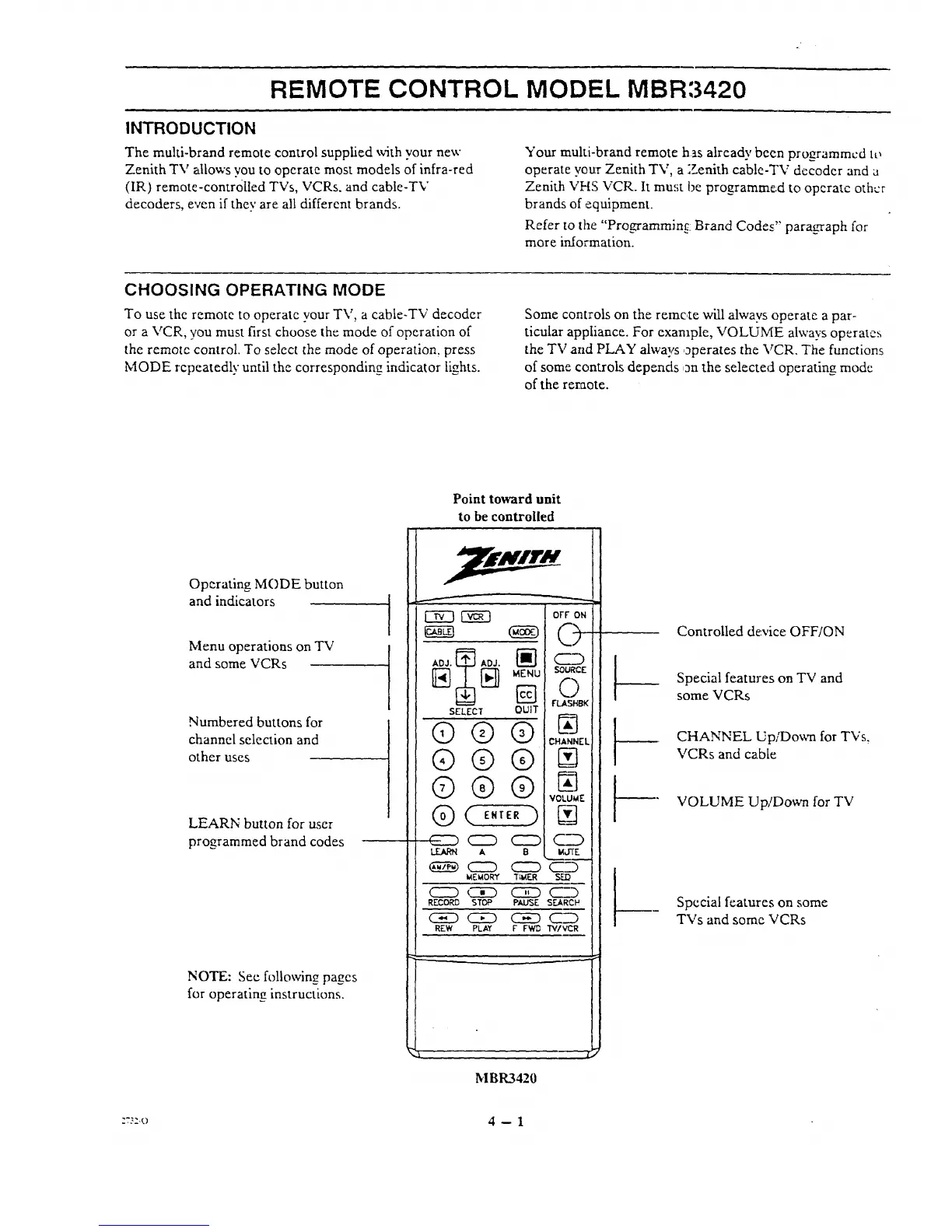 Zenith Vt-[S VCR. It must be programmed to operate other