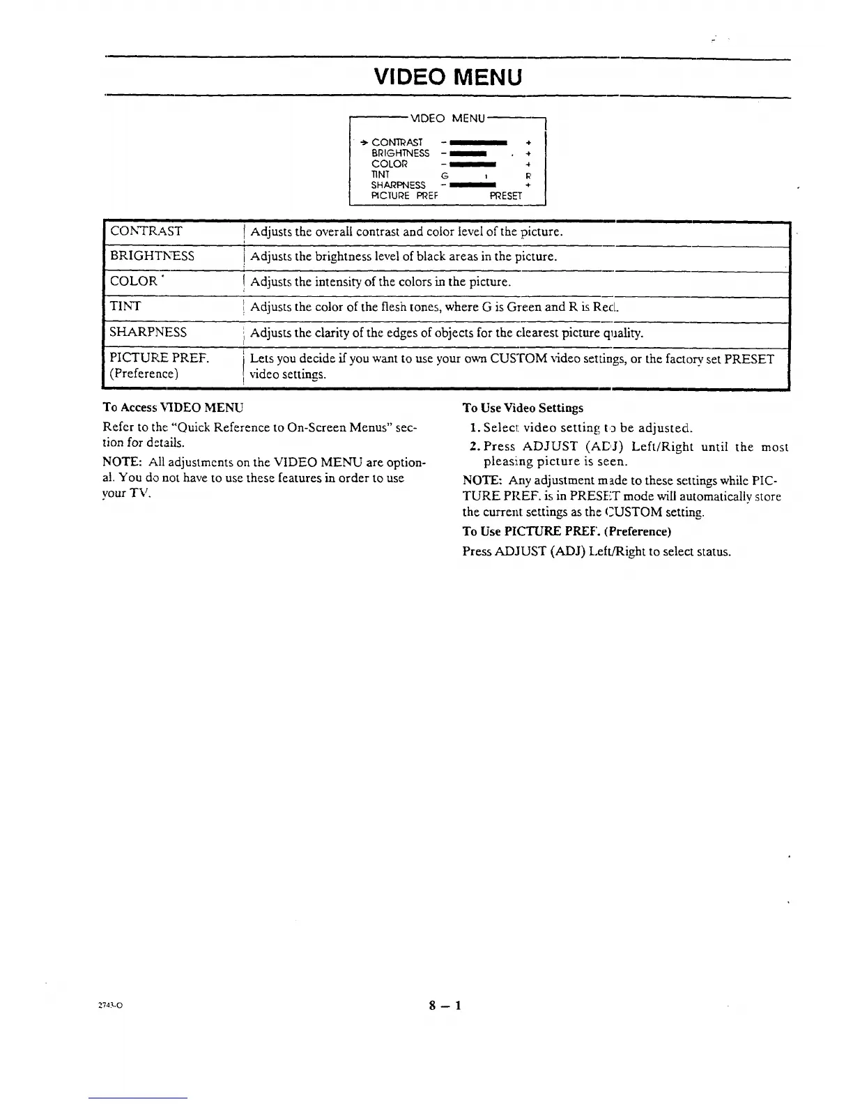 NOTE: All adjustments on the VIDEO MEN-U are option-