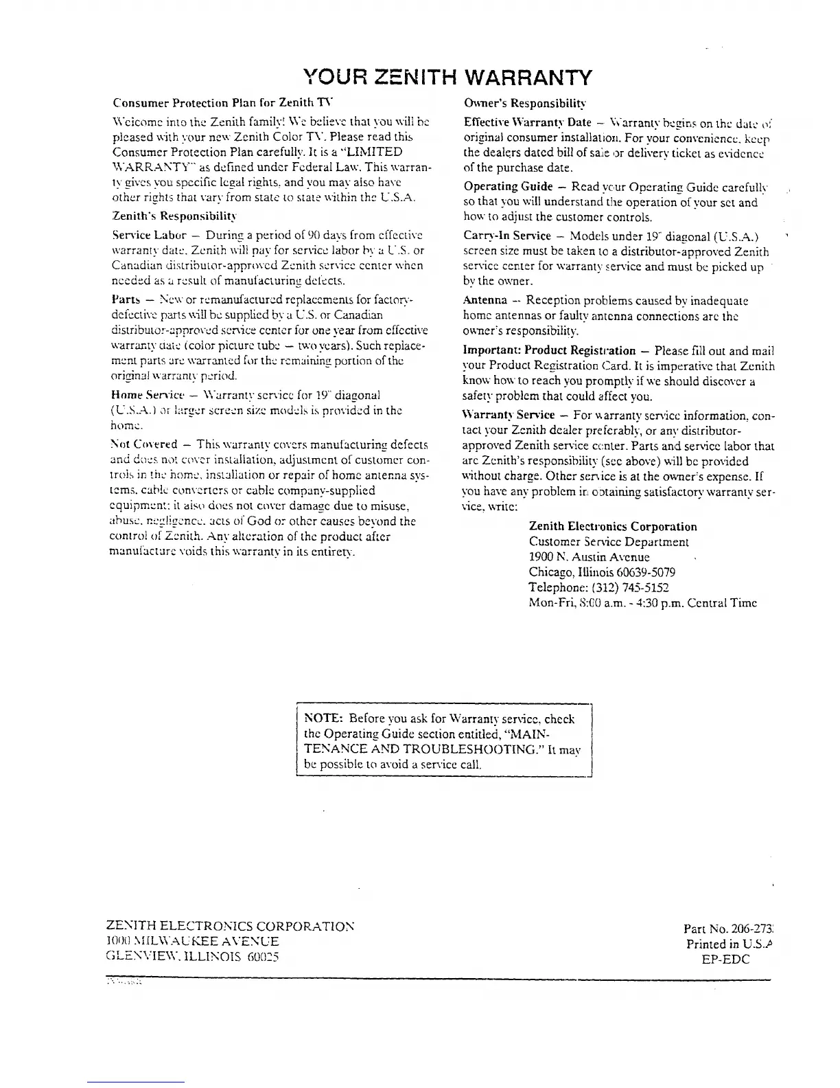 warranty date. Zenith wili pay' for service labor by a L'.S. or