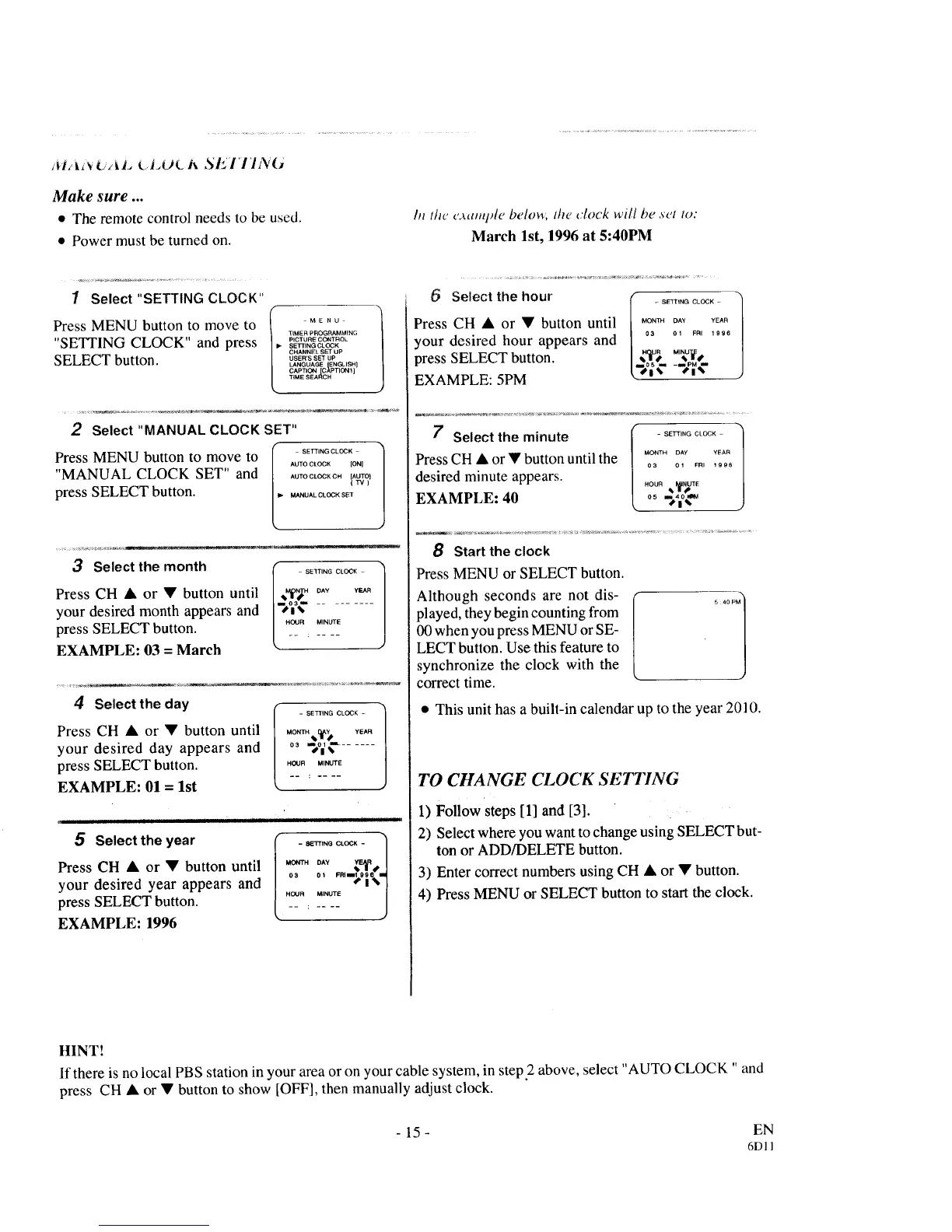 If there is no local PBS station in your area or on your cable system, in step2 above, select "AUTO CLOCK " and