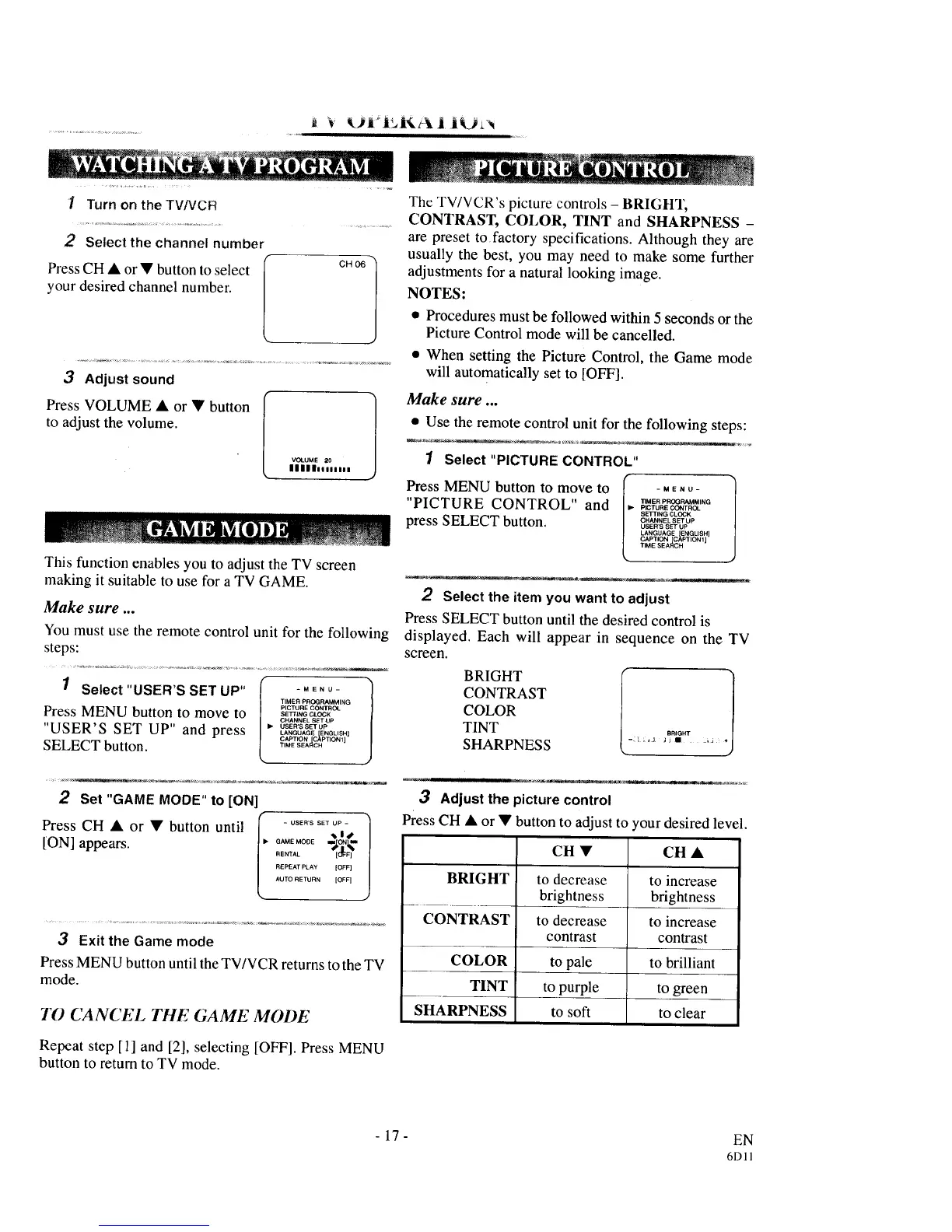 The TV/VCR's picture controls - BRIGHT,