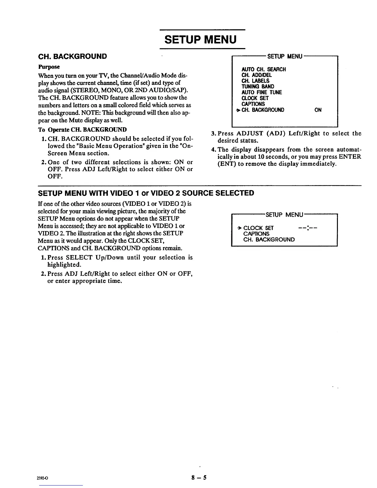SETUP MENU WITH VIDEO 1 or VIDEO 2 SOURCE SELECTED