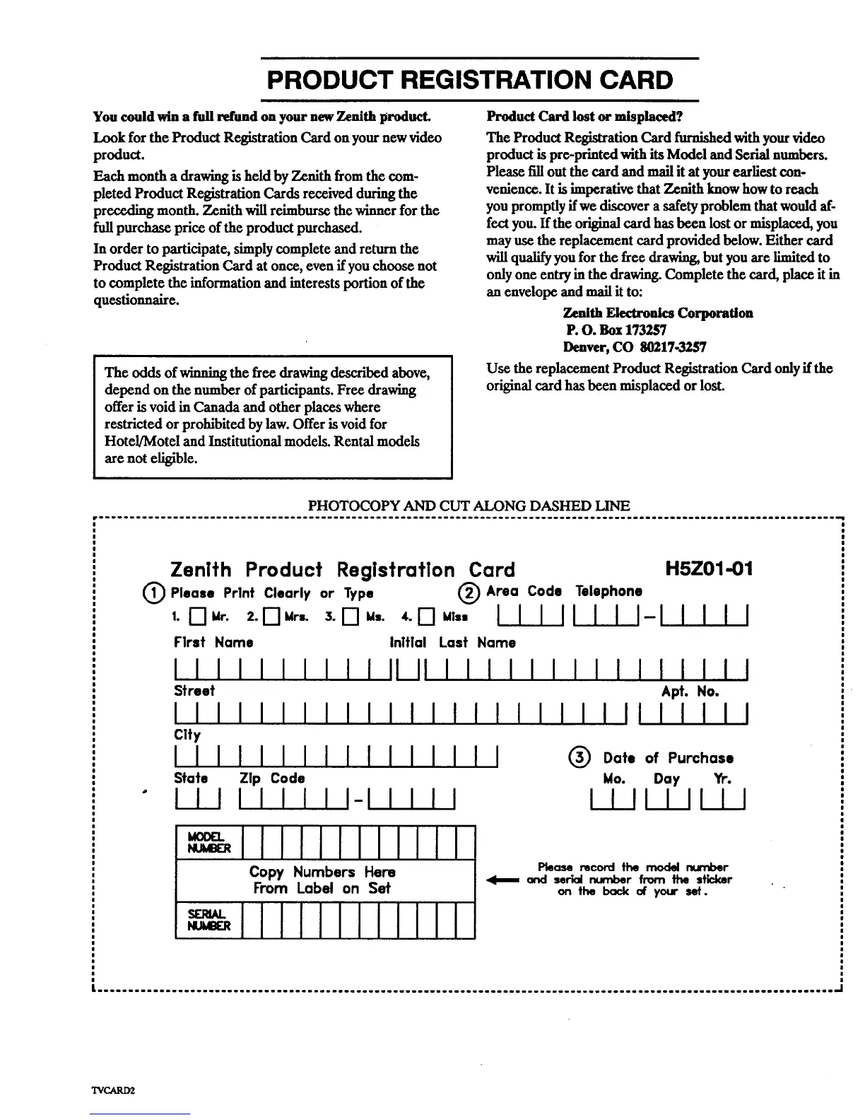 Zenith Product Registration Card H5Z01-01