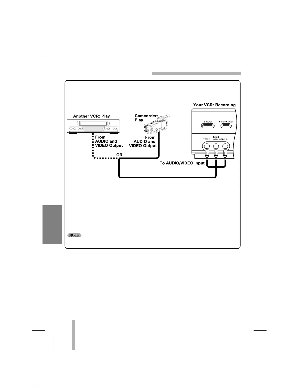 1. Connect the camcorder’s (or another VCR’s) A/V outputs to the VCR’s front A/V inputs as