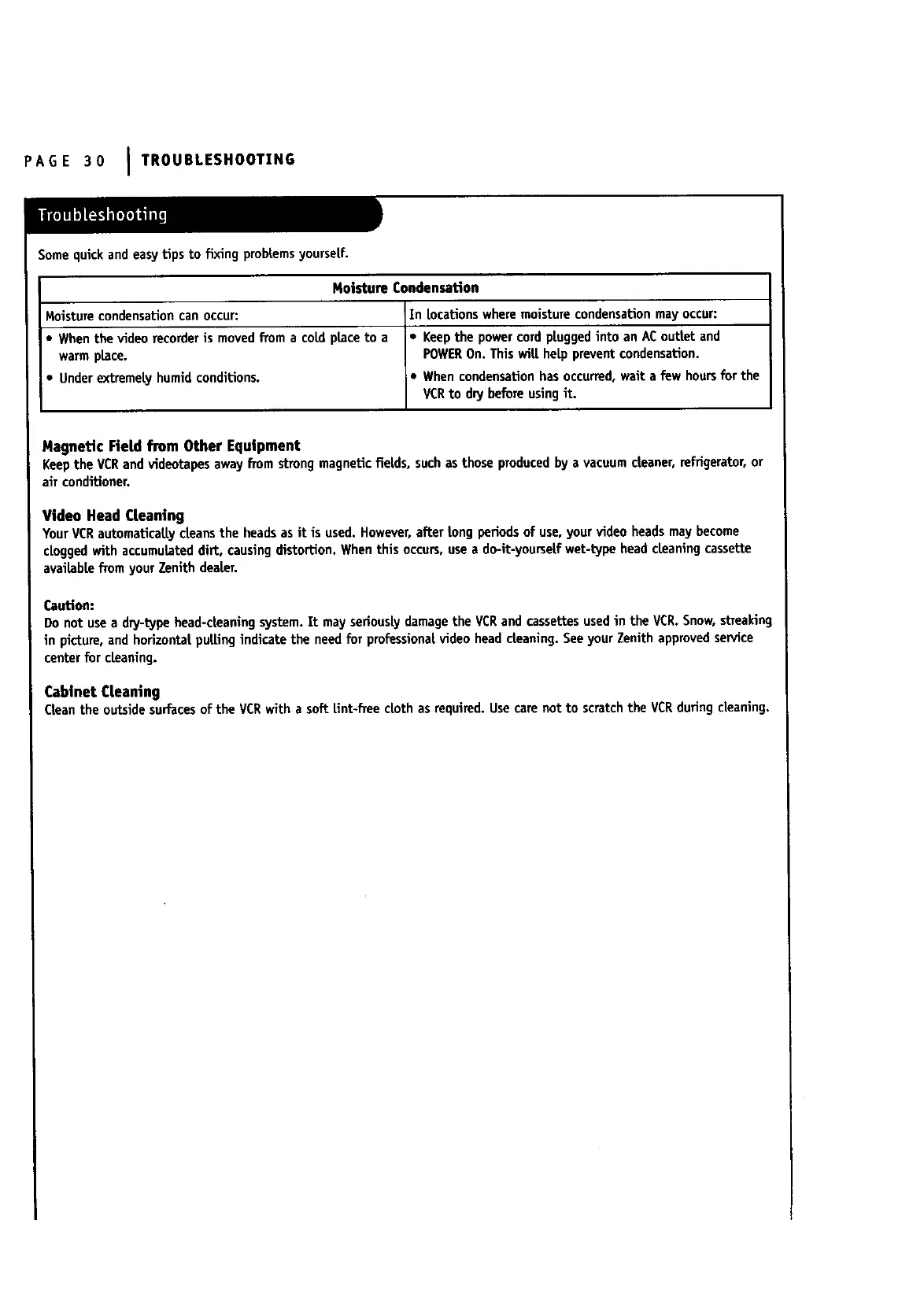 Do not use a dry-type head-cleaning system. It may seriouslydamage the VCR and cassettes used in the VCR. Snow, streaking