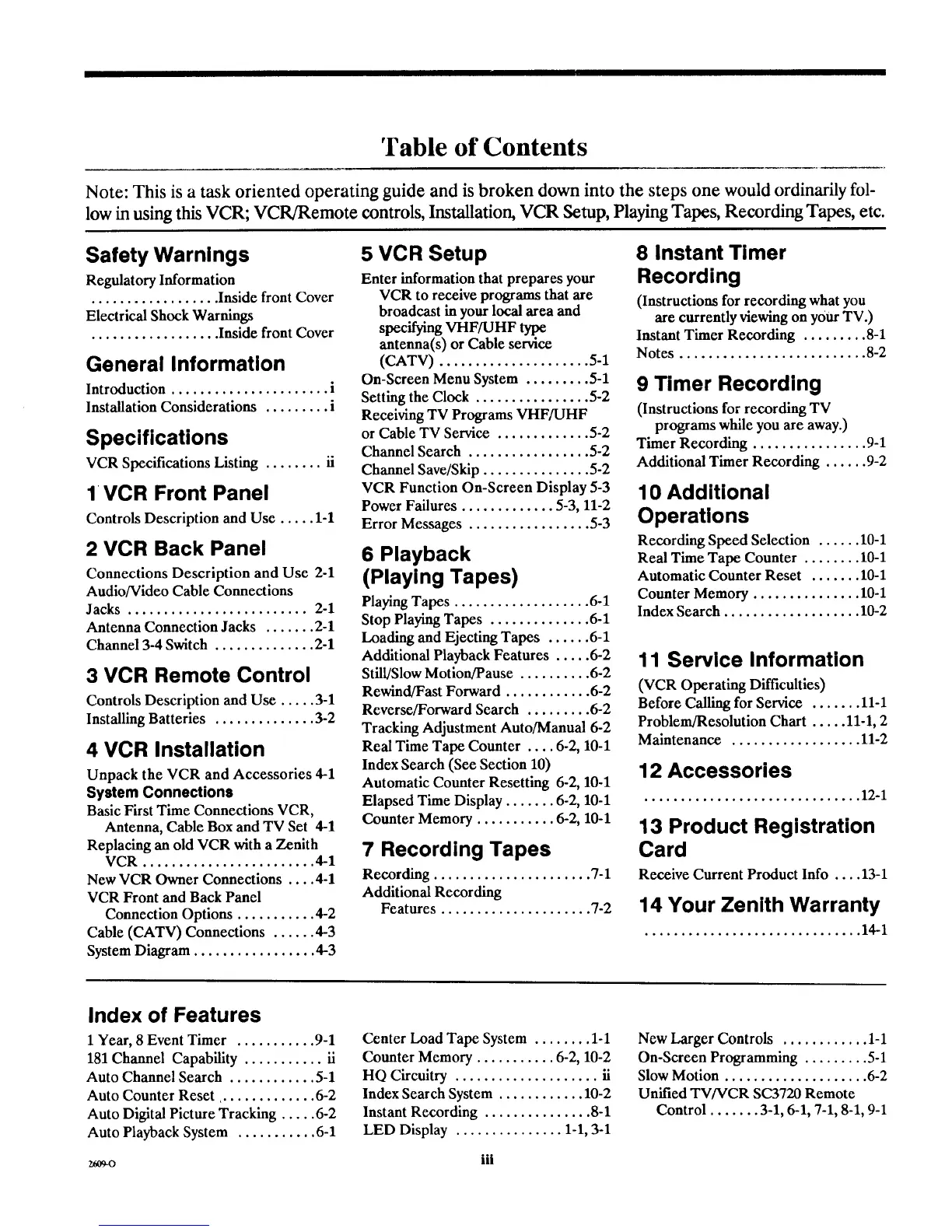 VCR Specifications Listing ........ ii