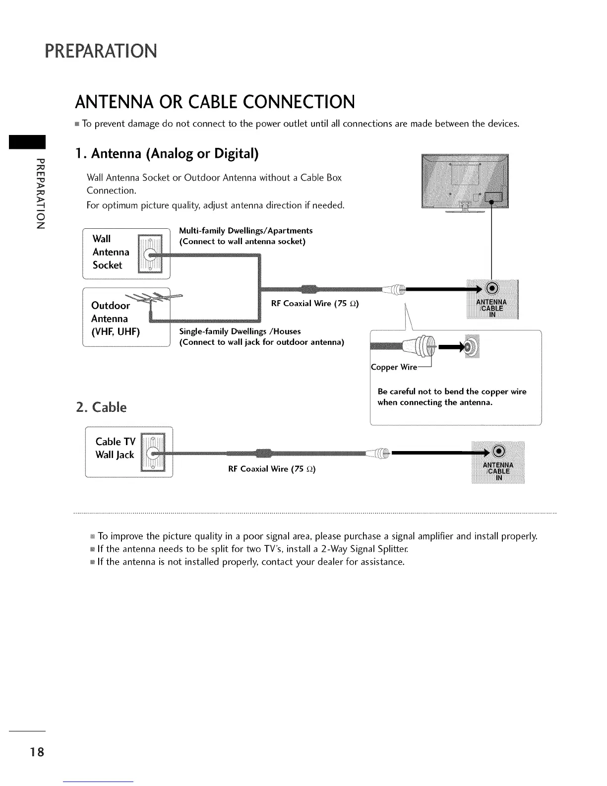 To improve the picture quality in a poor signal area, please purchase a signal amplifier and install properly.
