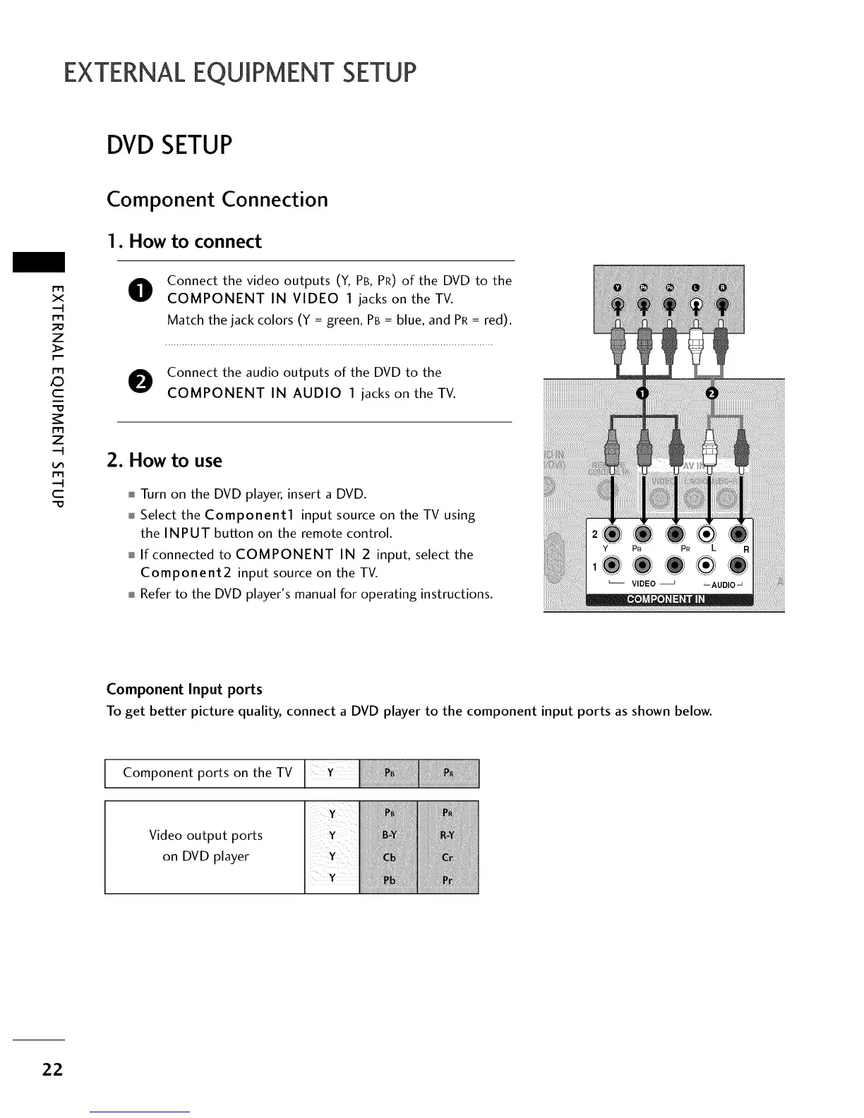 To get better picture quality, connect a DVD player to the component input ports as shown below.