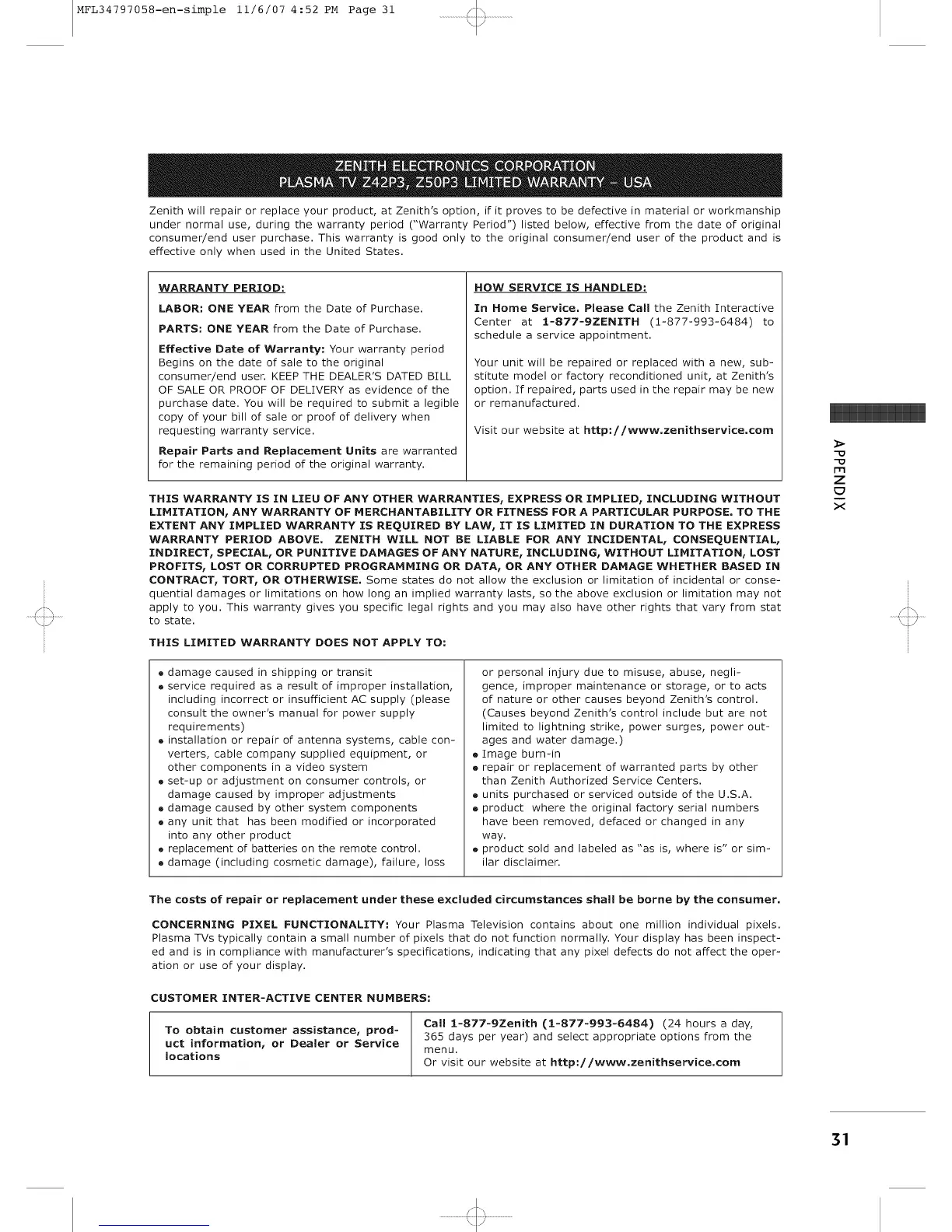Zenith will repair or replace your product, at Zenith's option, if it proves to be defective in material or workmanship