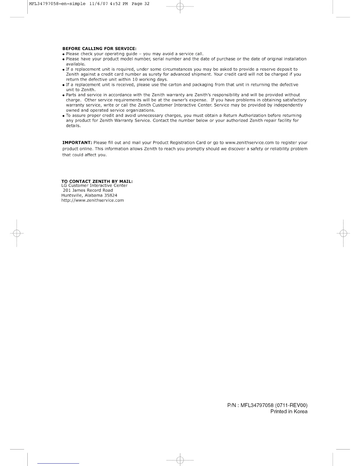 IMPORTANT: Please fill out and mail your Product Registration Card or go to www.zenithservice.com to register your