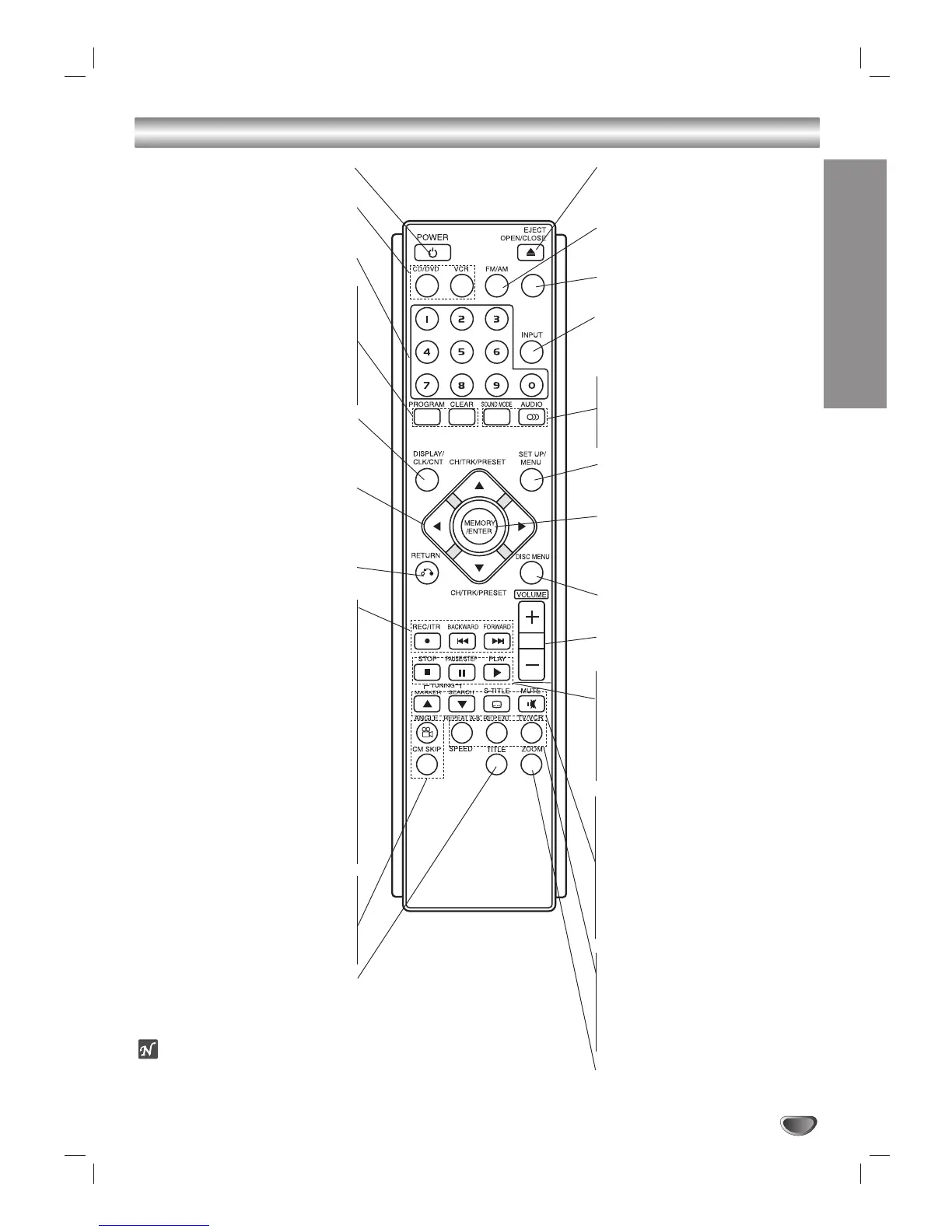 This remote control use the same buttons for VCR and DVD functions (ex. PLAY).