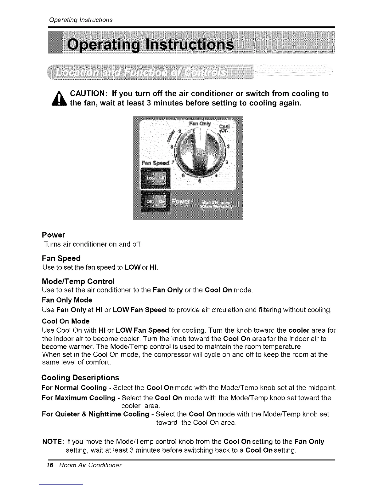 NOTE: If you move the Mode/Temp control knob from the Cool On setting to the Fan Only