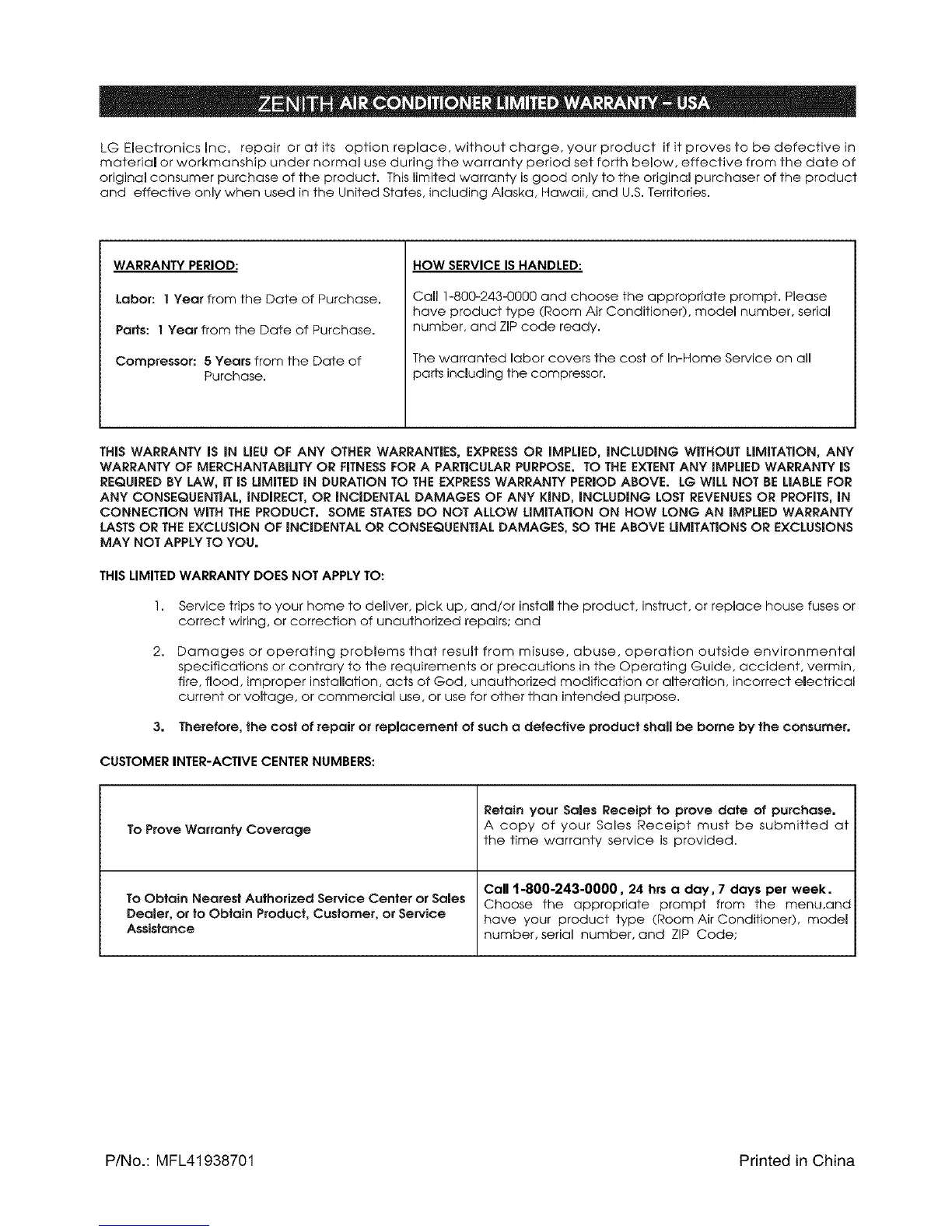 LG Electronics Inc. repair or at its option replace, without charge, your product if it proves to be defective in