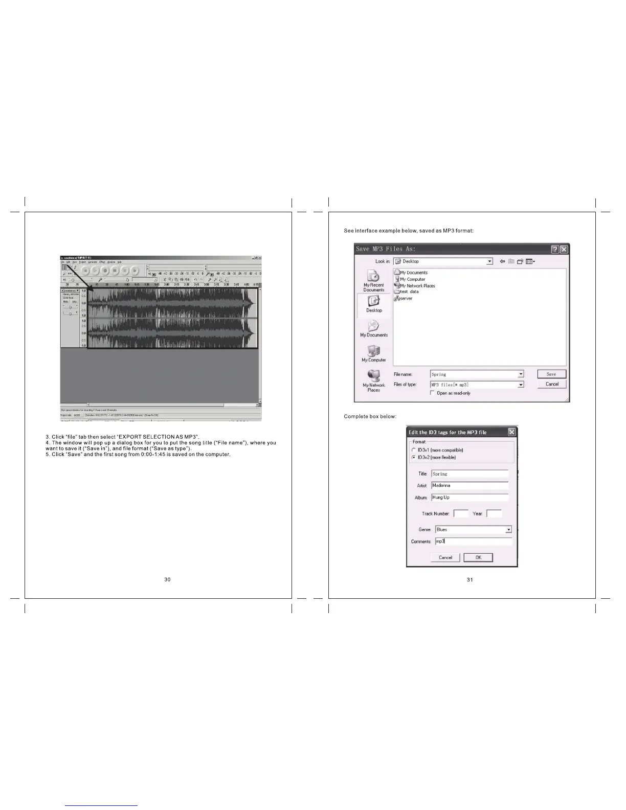 Zennox D3939 - Exporting Individual Tracks as MP3; Selecting Audio Segments; Saving MP3 Files and Editing Tags