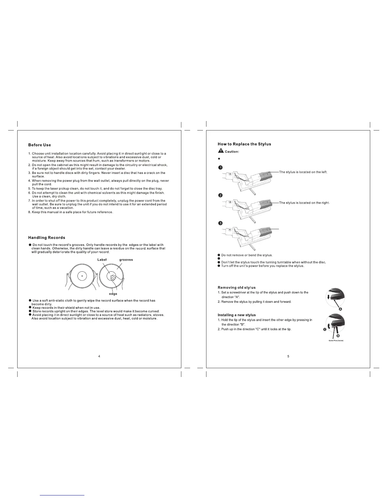 Zennox D3939 - Before Use and Setup; Unit Installation and General Care; Record Handling and Stylus Replacement