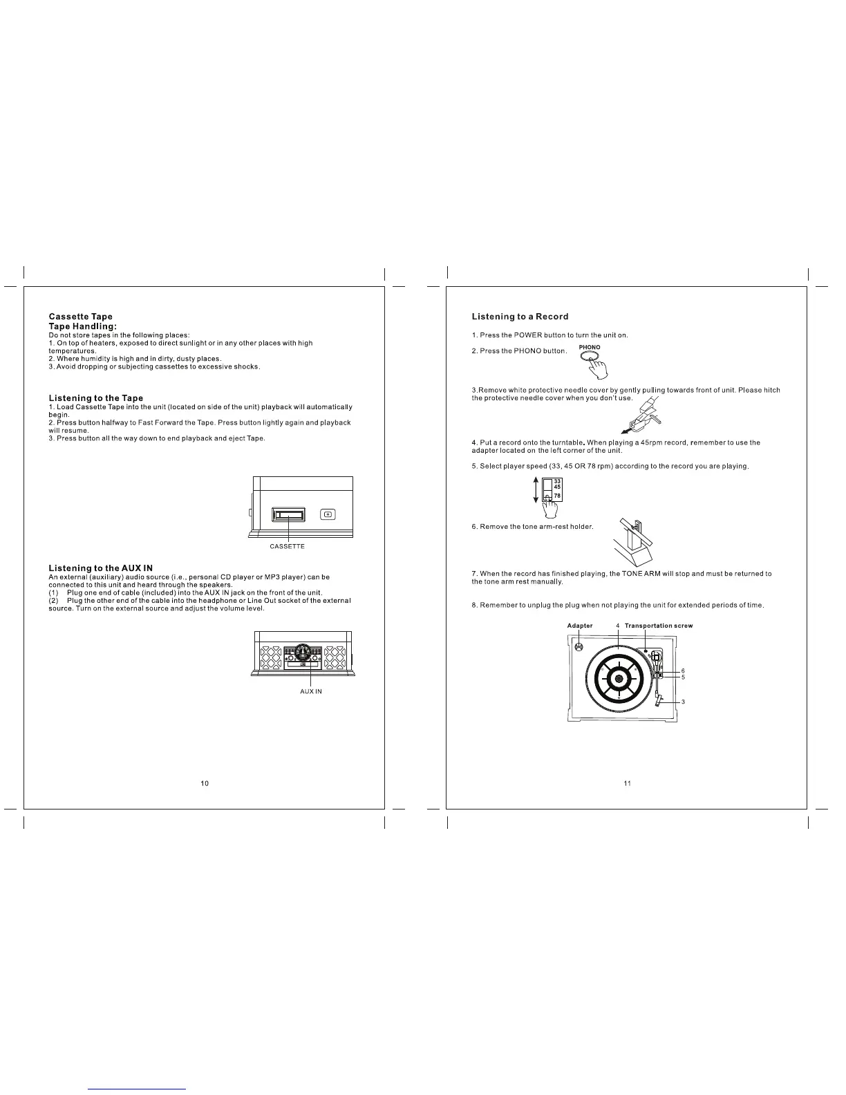 NOTE: When a cassette tape is inserted, the radio/phono/CD/AUX will automatically shut off.
