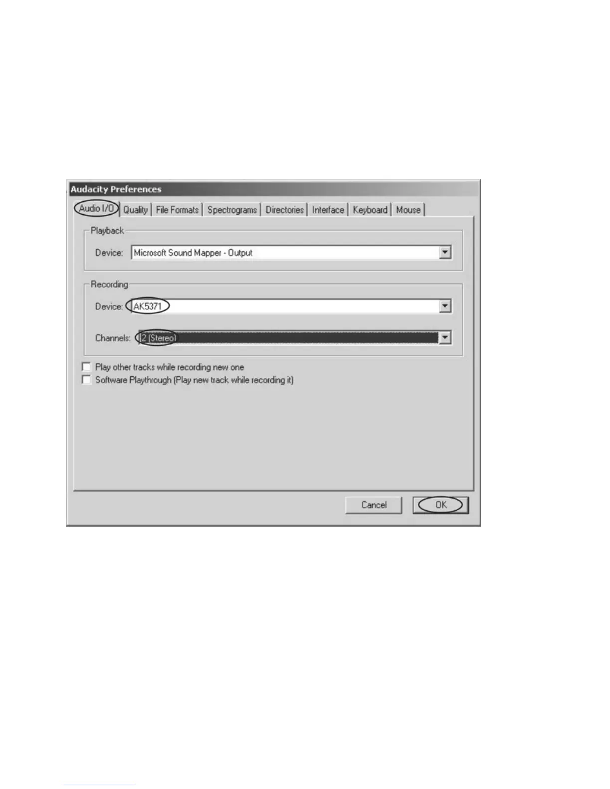 z Click the “Audio I/O” at the Audacity Preferences interface.