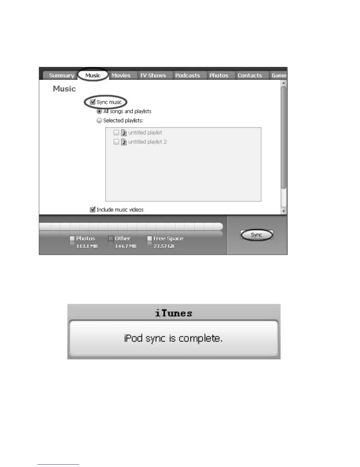 all existing songs and play lists on the iPod Administrator will be removed. Click the “Sync” button to