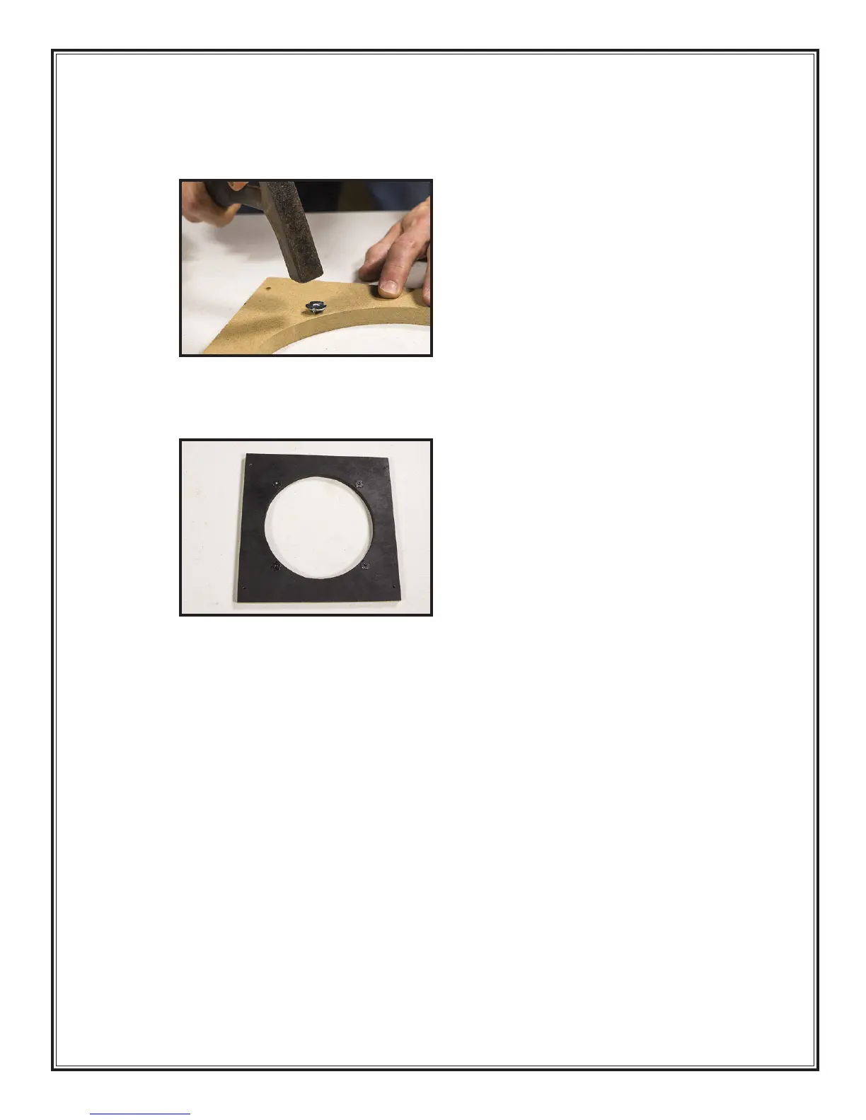 7. Use the hammer to tap the four t-nuts (Part # NU03) into the four holes near the round cutout.