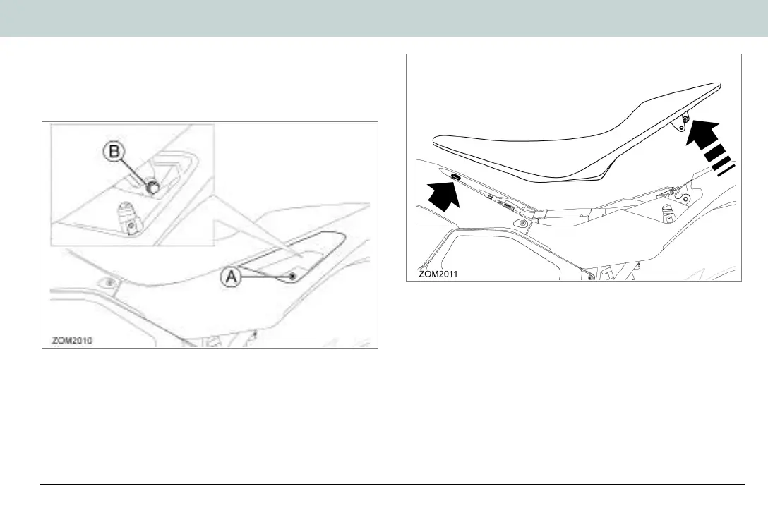 2. Remove two bolts (B) securing the rider’s seat to the frame.