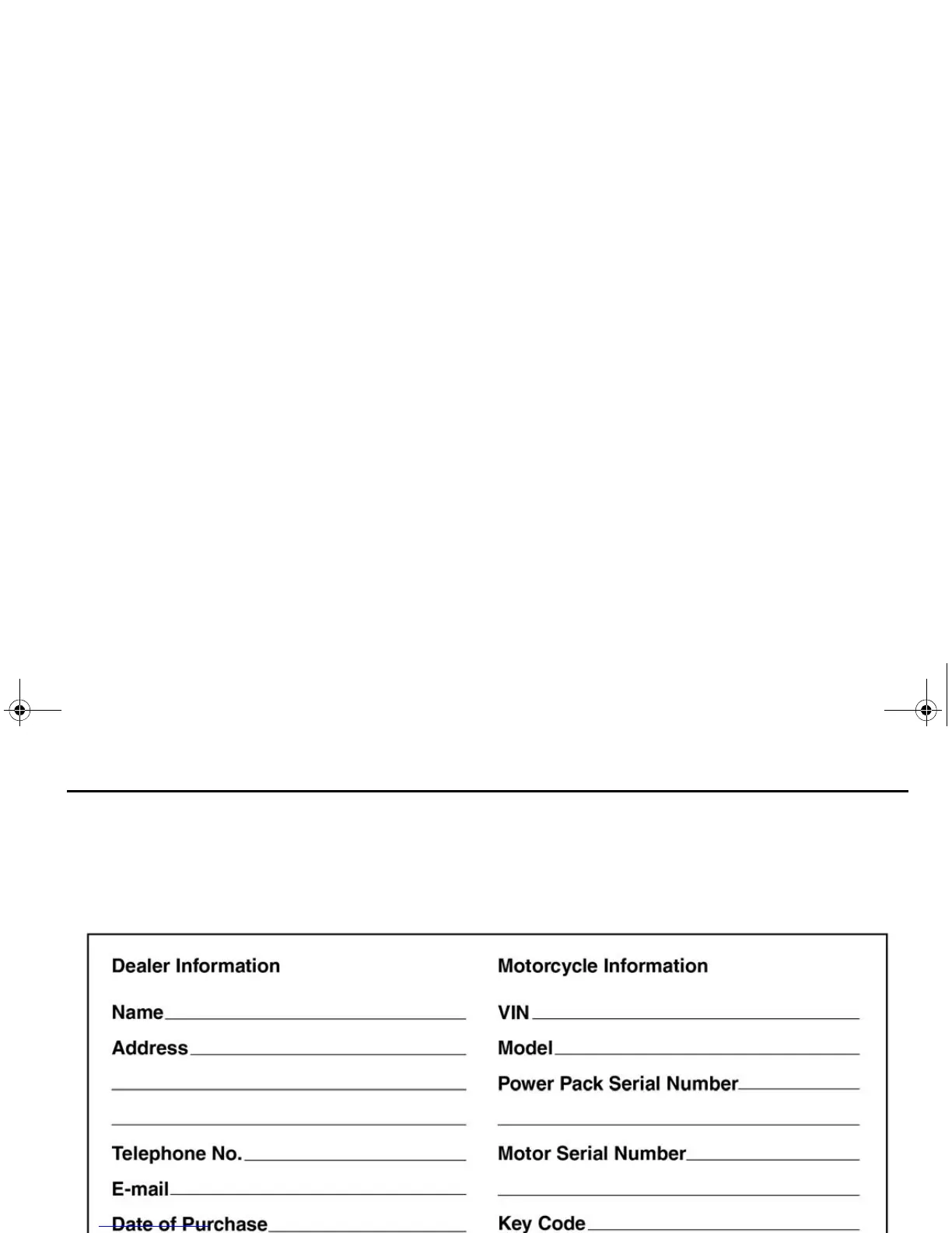 Record information pertaining to your motorcycle here. When contacting your dealer, you may need to provide this
