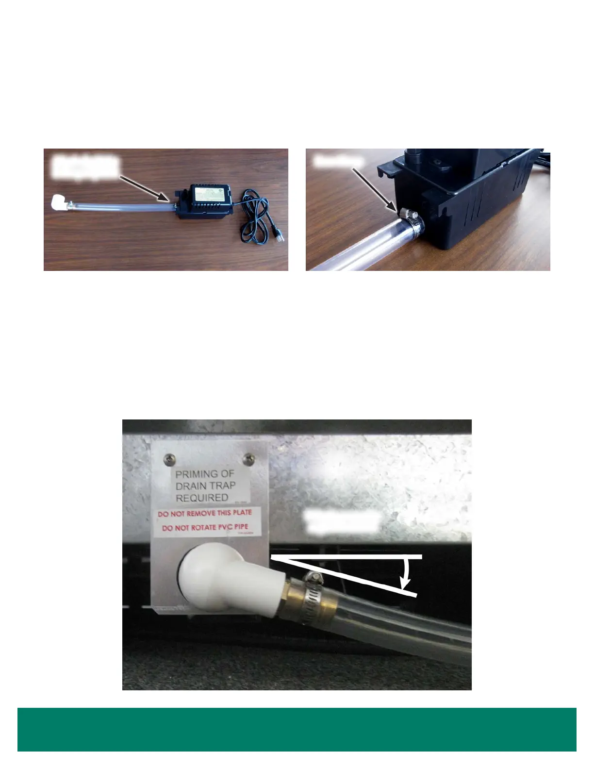 9. Place the vinyl tube with PVC elbow over the inlet to the condensate pump. Fasten into place using the supplied hose clamp.