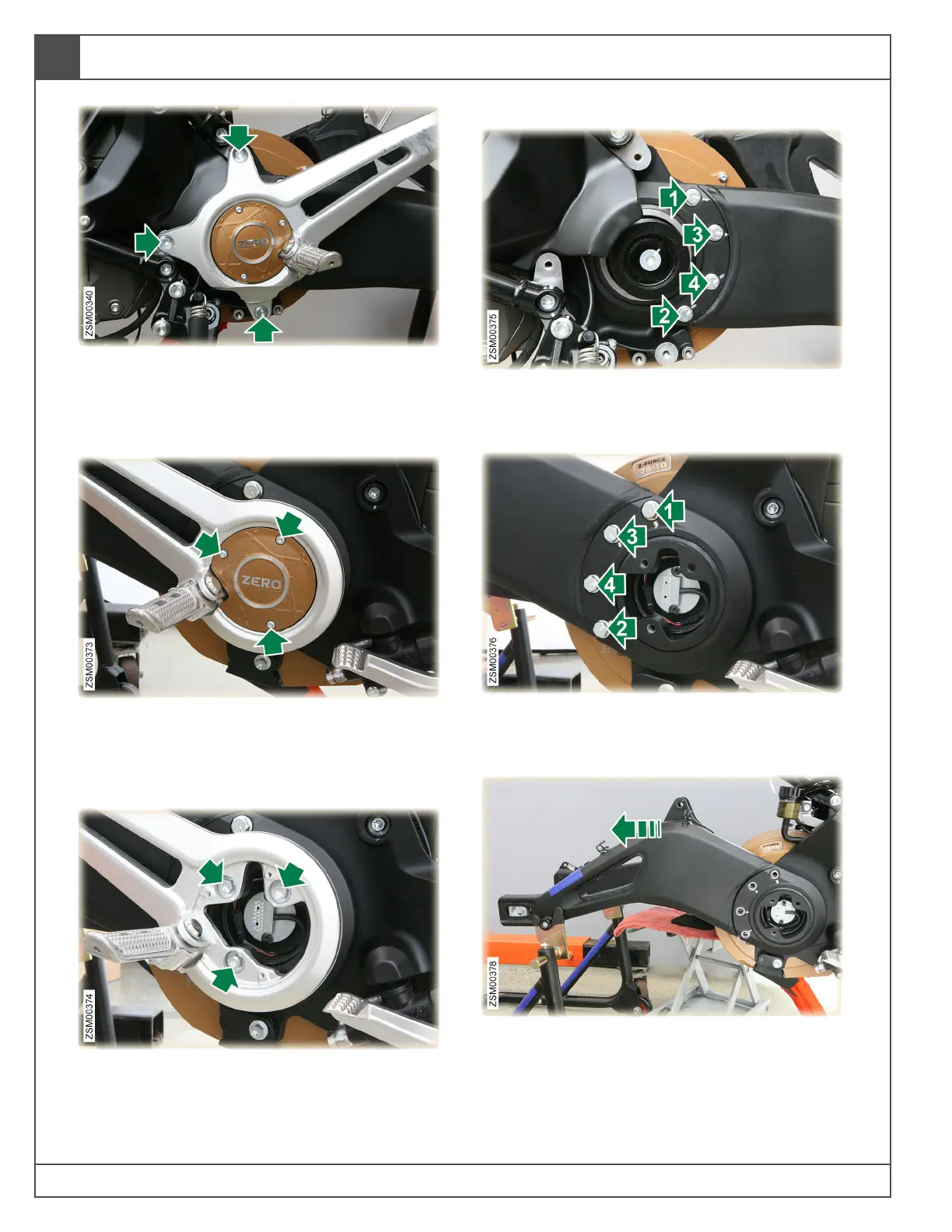 54. Remove bolts (x4) securing swingarm to right