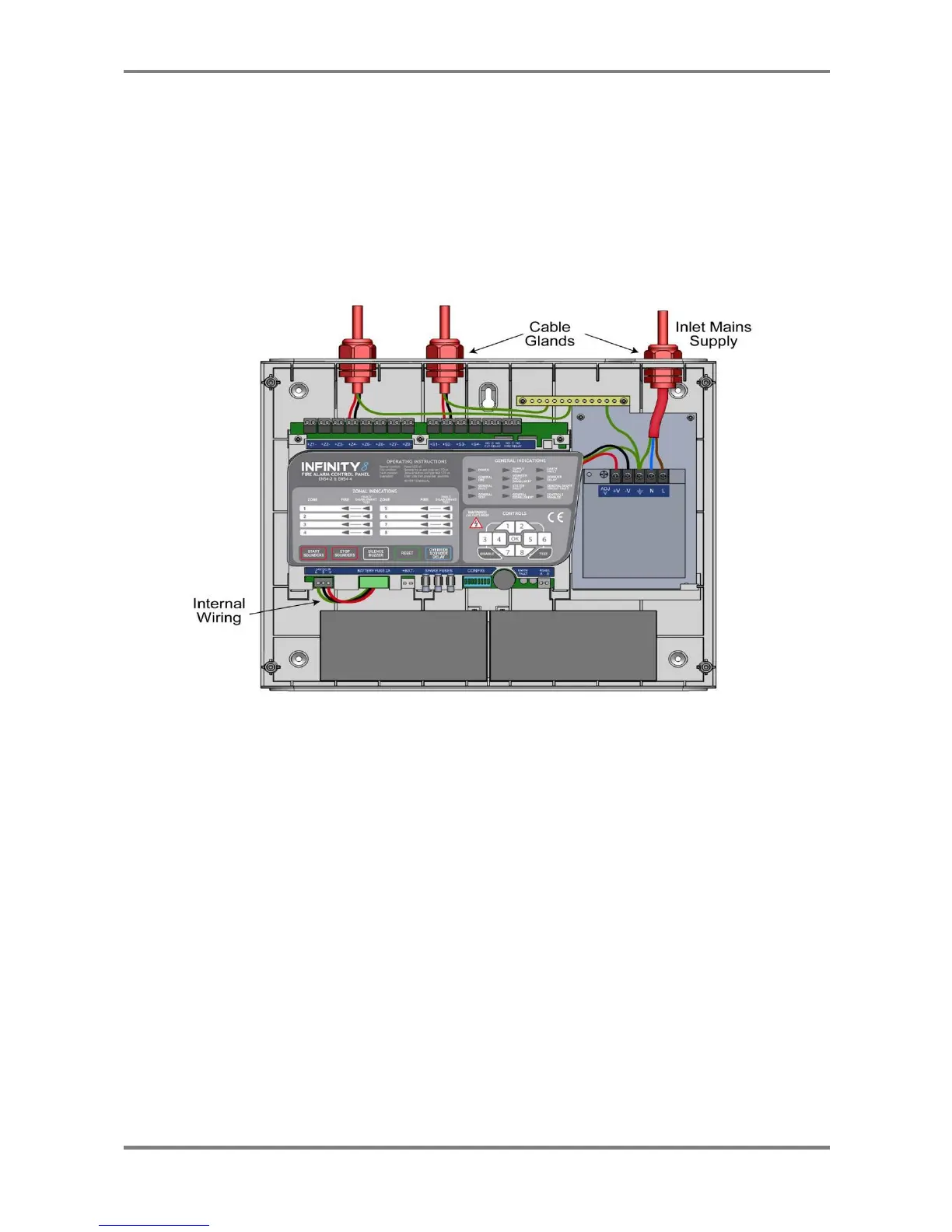 All cables entering the enclosure should use cable glands. The Detector and Sounder circuits should be connected to the