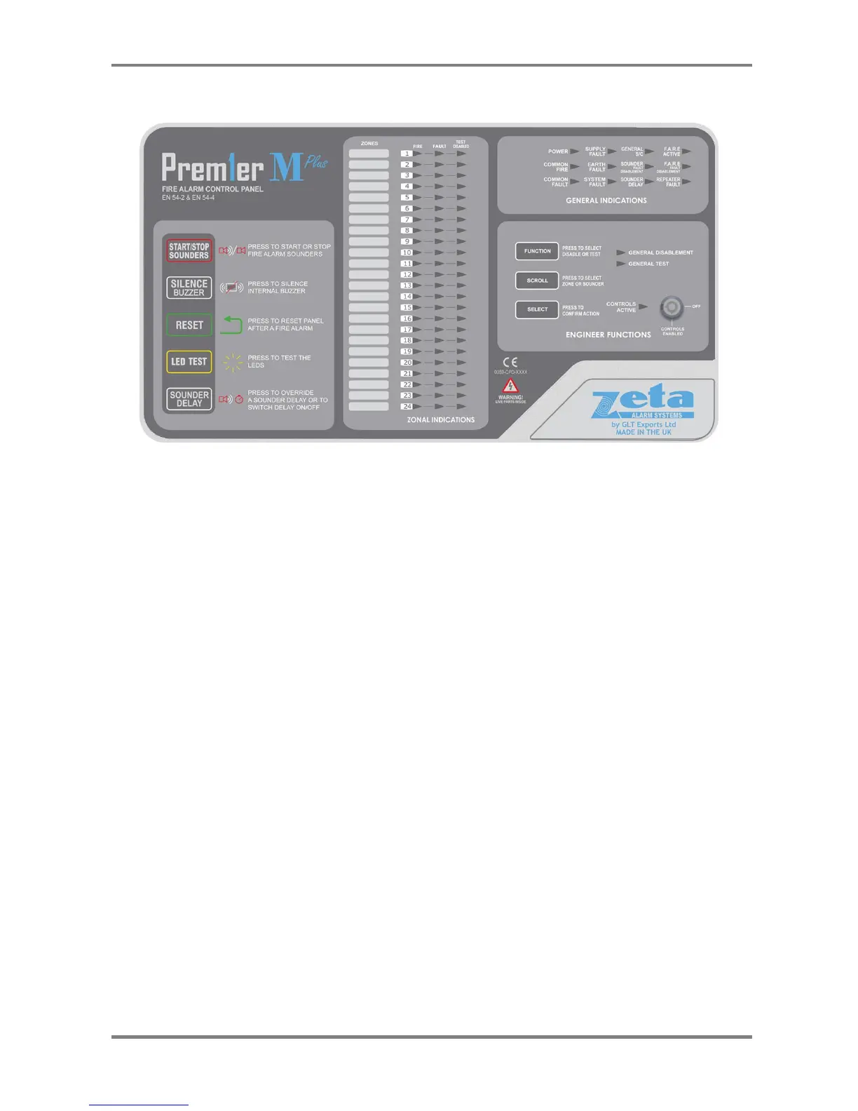 In the Accessed State (Access level 2), the user can start or stop the fire alarm sounders, silence the panels internal buzzer, reset