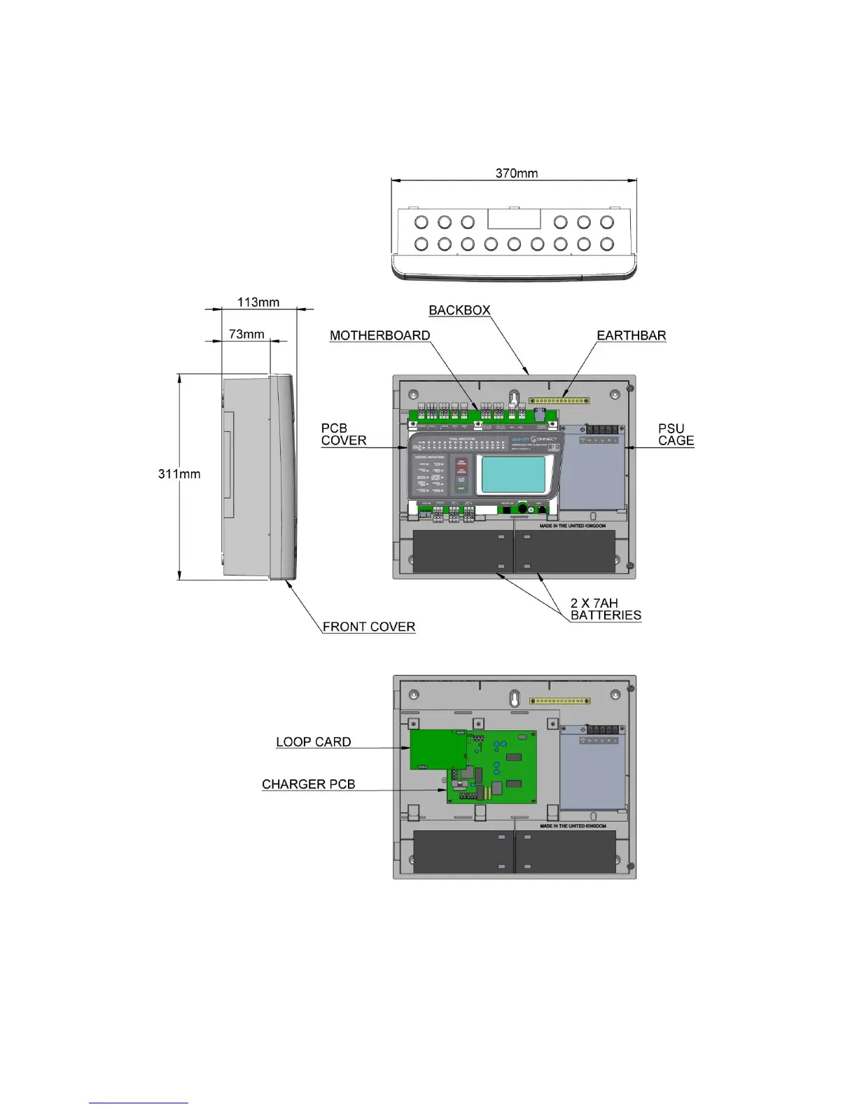 Figure1: Plan view of Smart Connect panel showing internal view with main PCB fitted and with main PCB removed