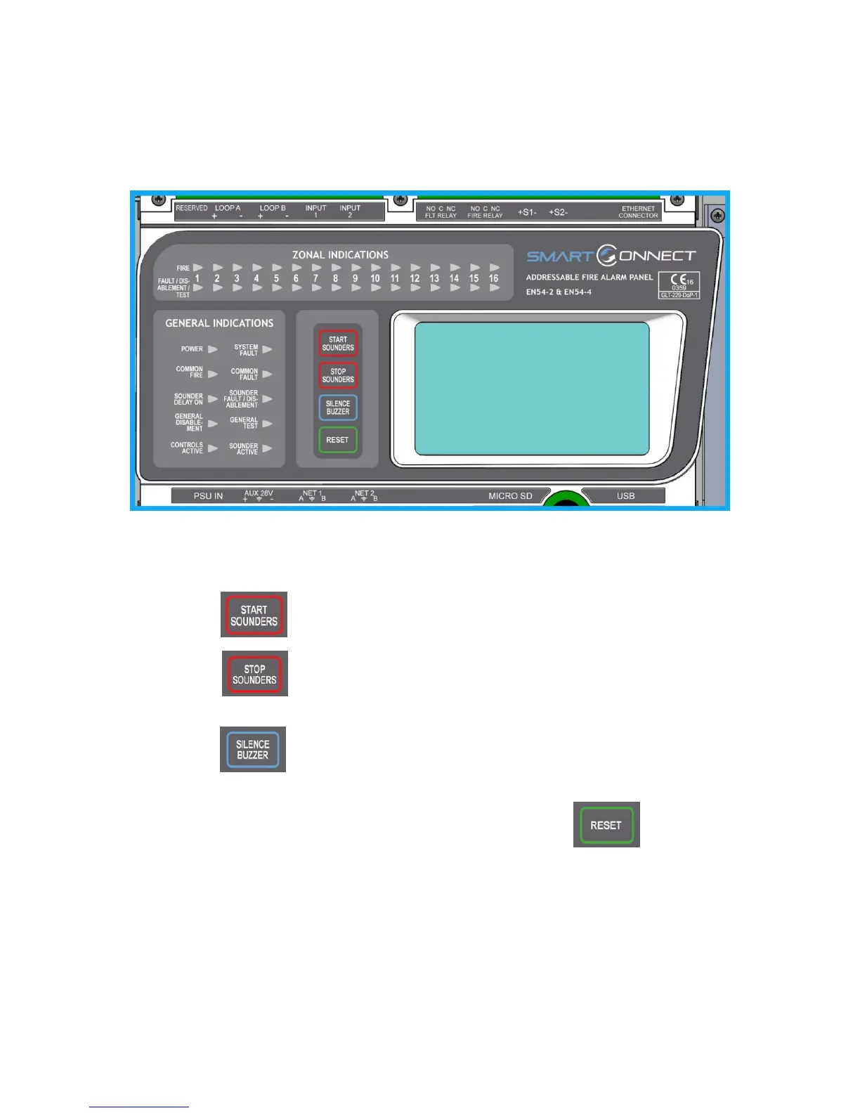 This control can be used by authorised personnel to stop or silence the sounders whilst the panel is in the