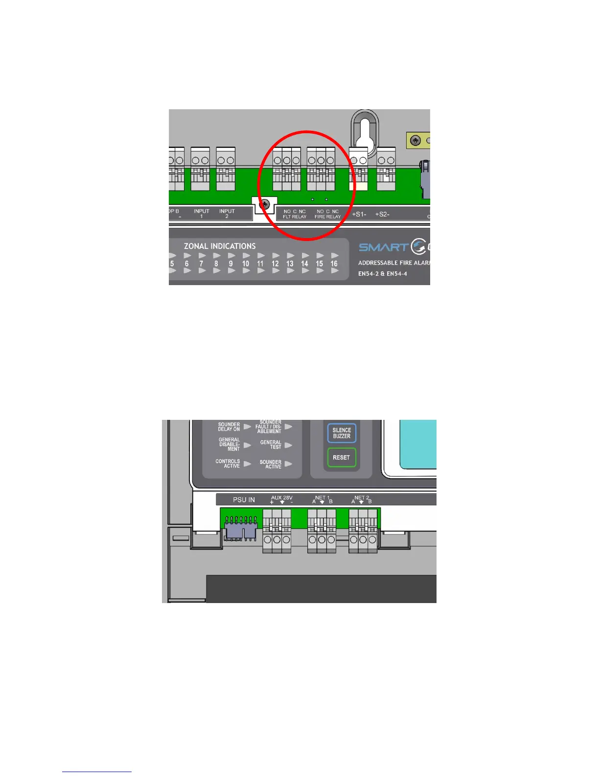 Figure 3: Connections for fire relay, fault relay, conventional sounders and auxiliary DC outputs.