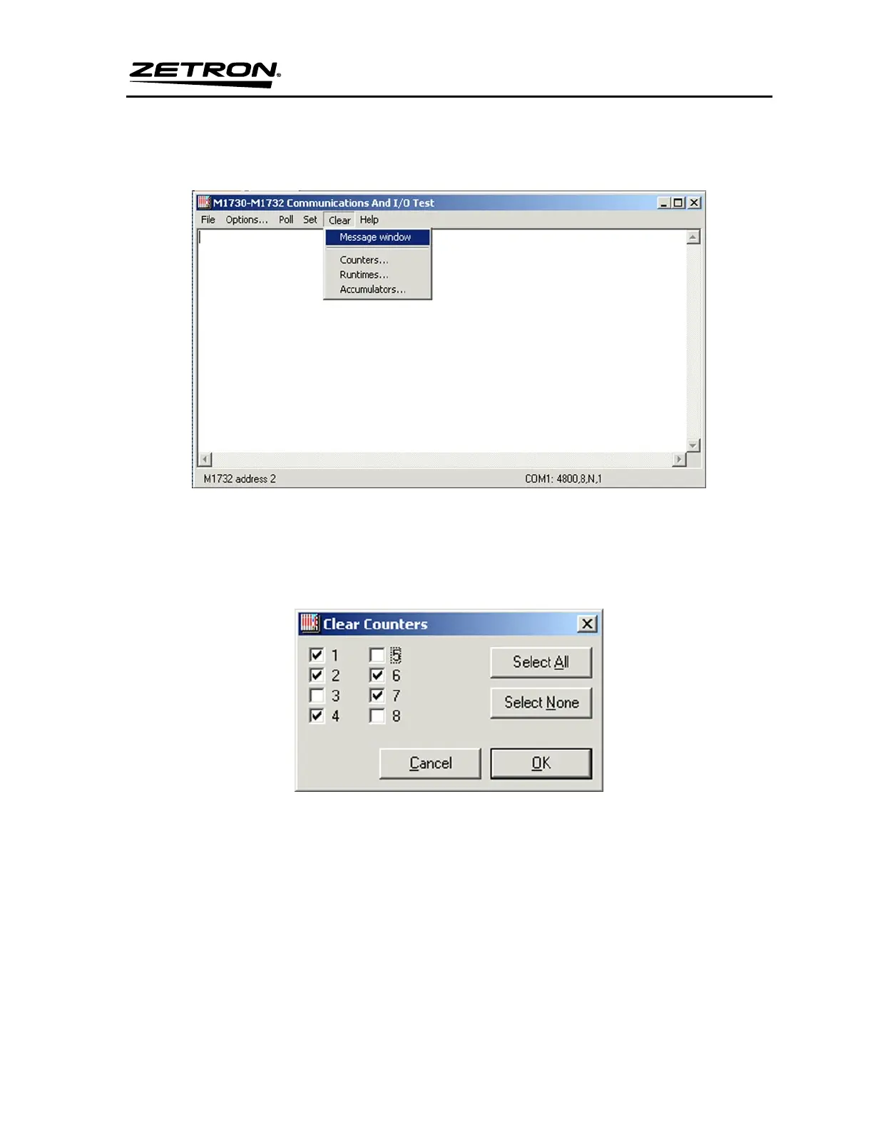 The Clear menu provides options for clearing the message window and for clearing counters,