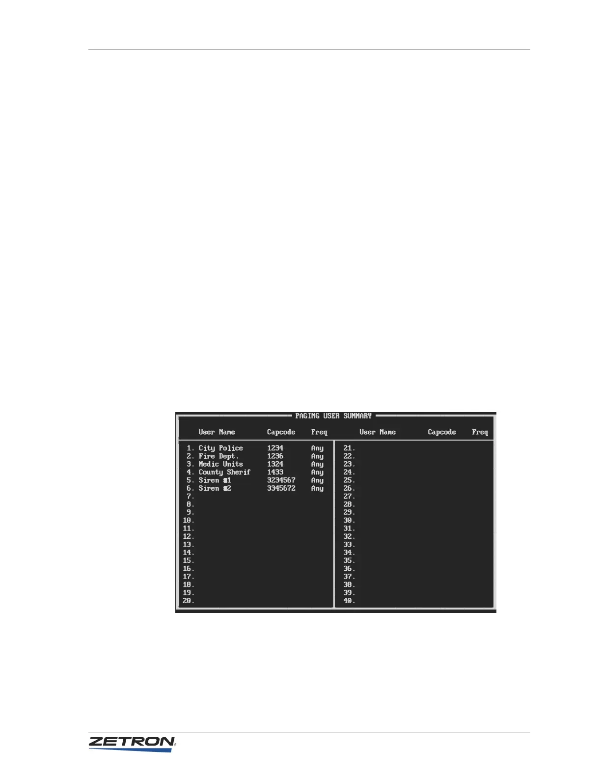 (U)ser summary menu selection will display all of the paging database user specific