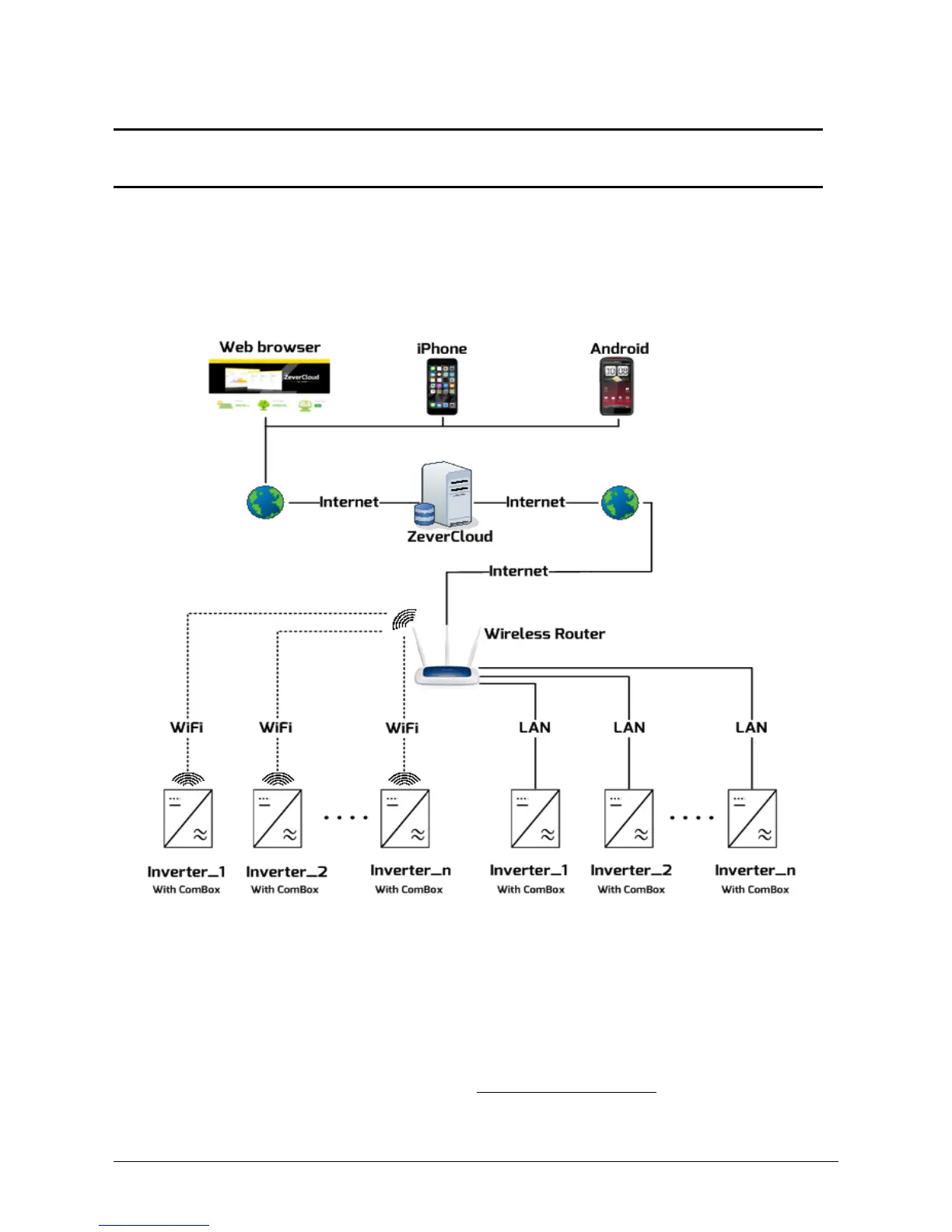 One ZeverCom/ZeverManager connects inverters via an RS485 bus. The overall