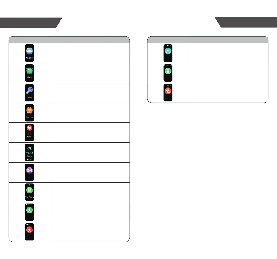 zewa 21200 - Weather and Alarm Icons; Tools and Settings Icons; Heart Rate and Step Icons; Camera and Phone Finding Icons