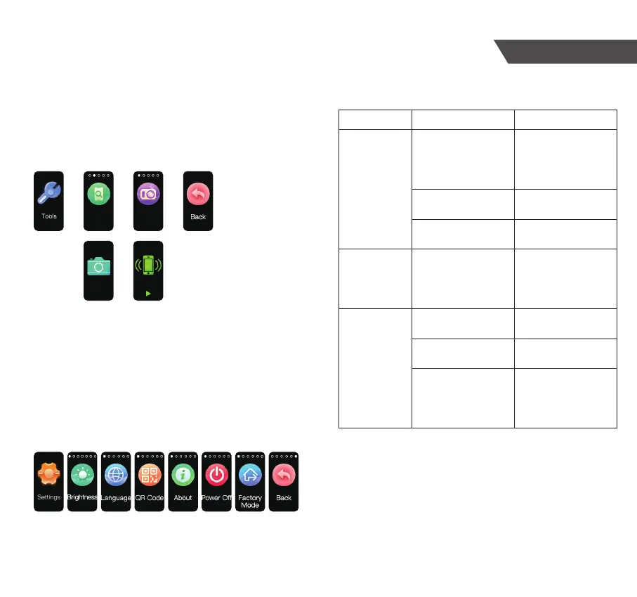 Short press the main Tools screen moves to the main settings screen.