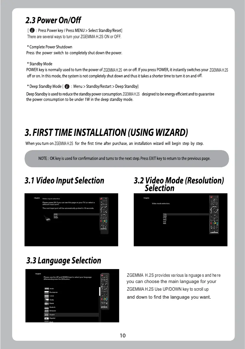 ZGEMMA H.2S - 2.3 Power On;Off; 3. FIRST TIME INSTALLATION (USING WIZARD); 3.1 Video Input Selection; 3.2 Video Mode (Resolution) Selection