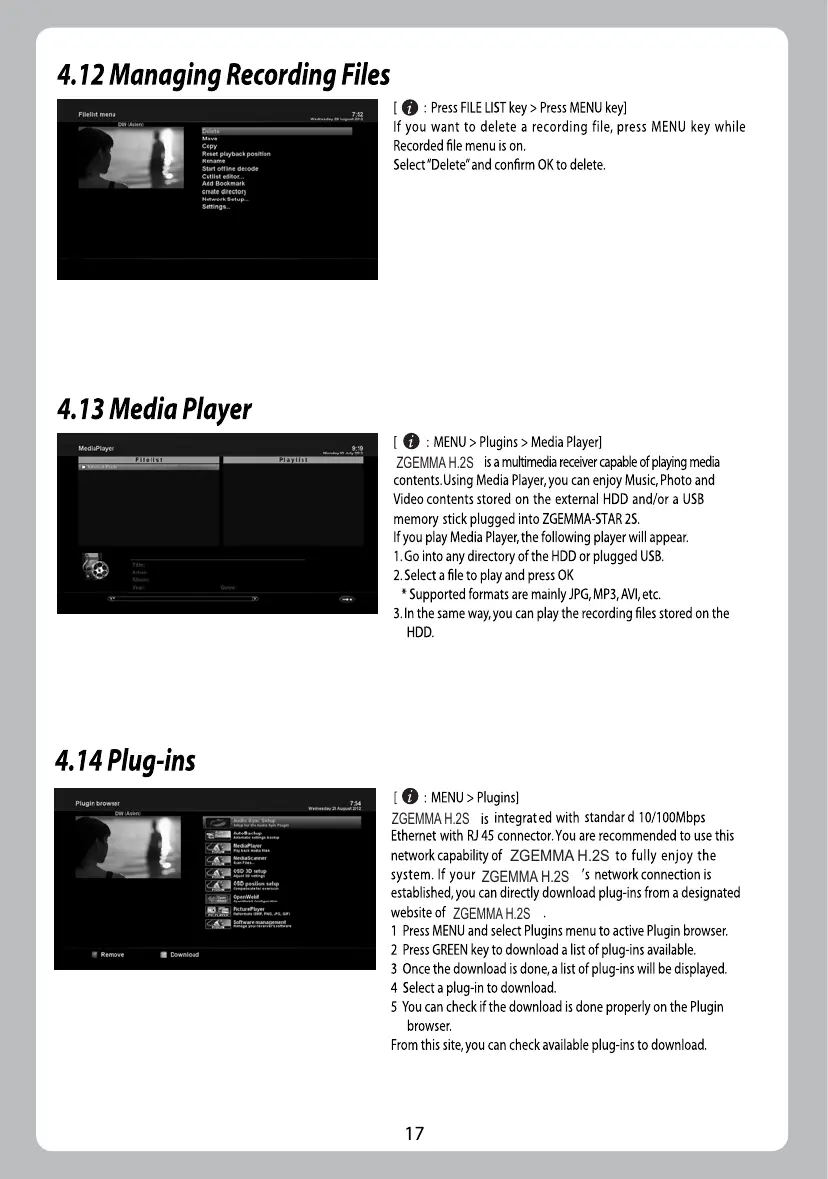 ZGEMMA H.2S - 4.12 Managing Recording Files; 4.13 Media Player; 4.14 Plug-ins