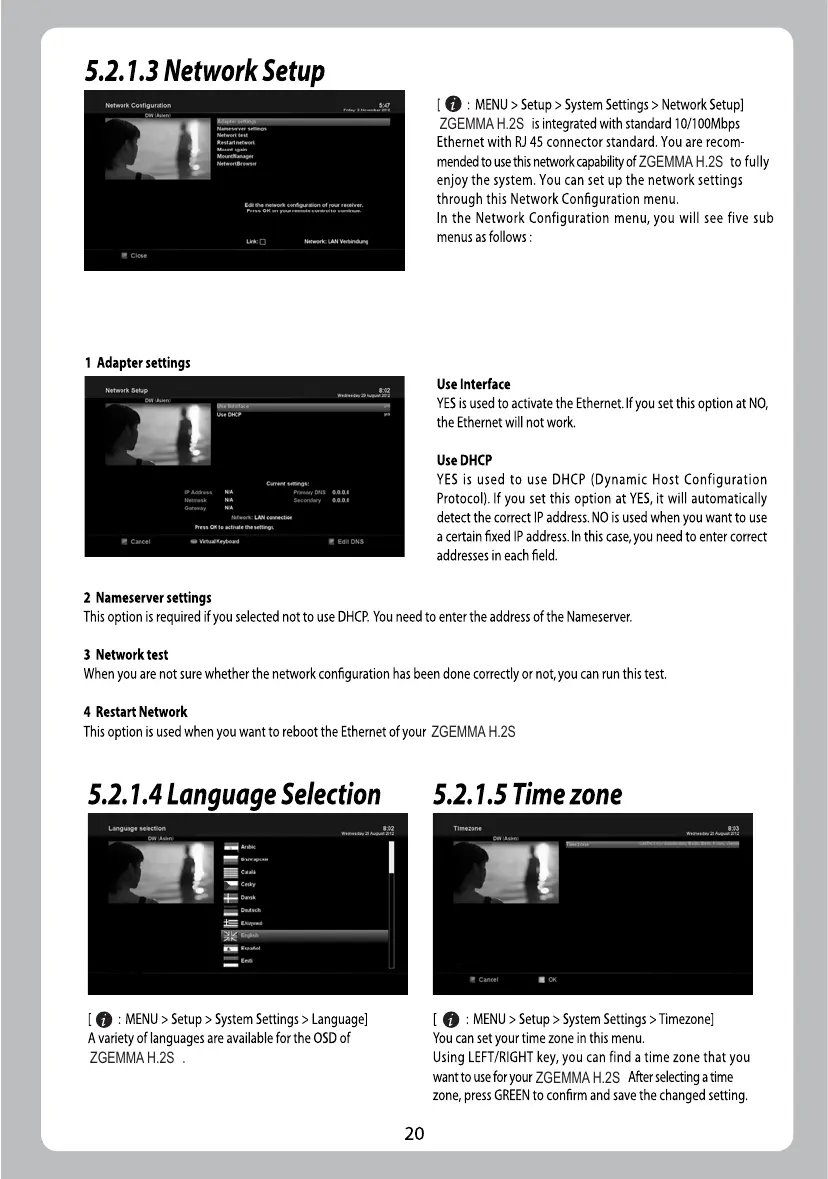 ZGEMMA H.2S - 5.2.1.2 Other settings; 5.2.1.3 Network Setup; 5.2.1.4 Language Selection; 5.2.1.5 Time zone