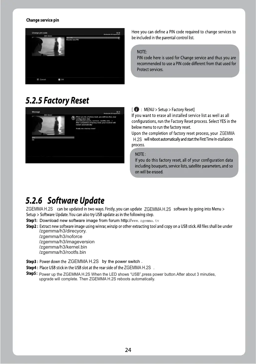 ZGEMMA H.2S - 5.2.5 Factory Reset; 5.2.6 Software Update