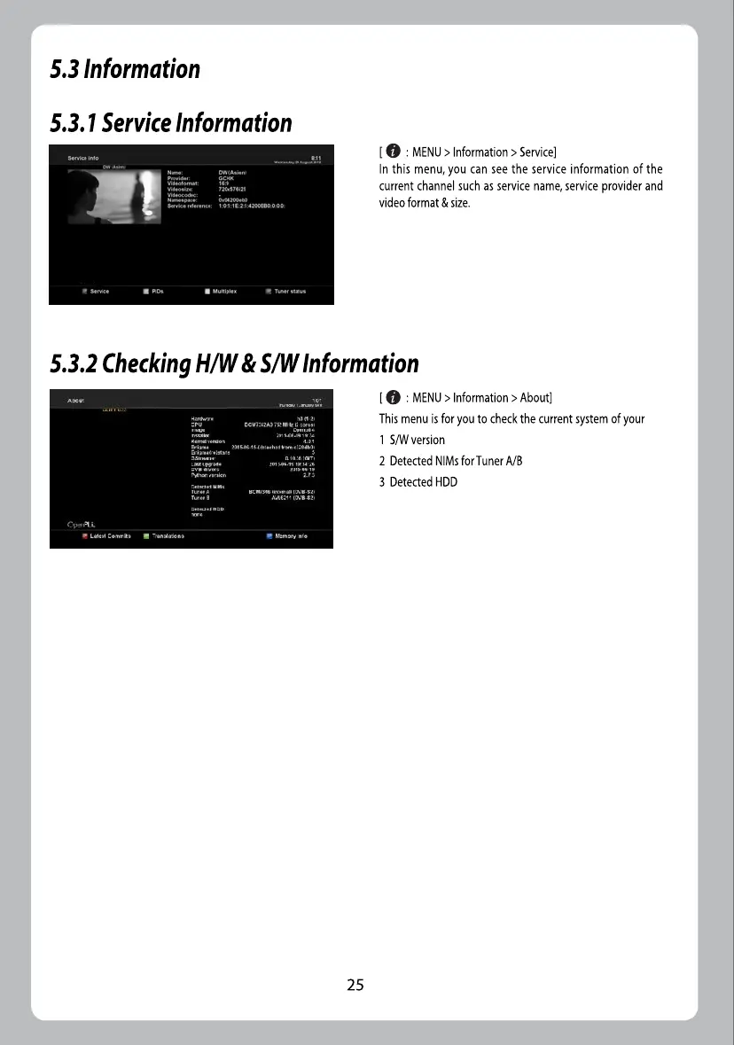 ZGEMMA H.2S - 5.3 Information; 5.3.1 Service Information; 5.3.2 Checking H;W & S;W Information