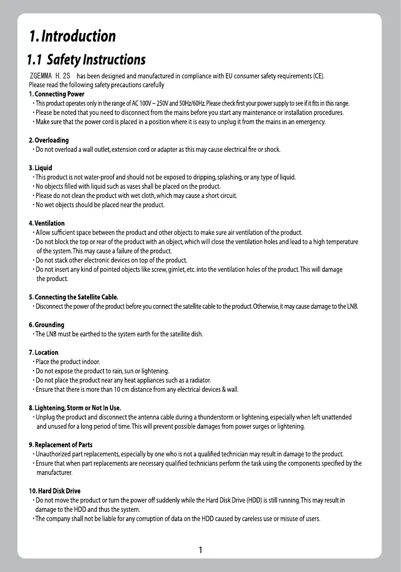 ZGEMMA H.2S - 1. Introduction; 1.1 Safety Instructions