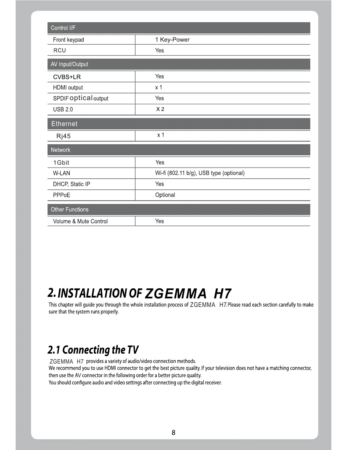 ZGEMMA H7 - 2. INSTALLATION OF ZGEMMA H7; 2.1 Connecting the TV