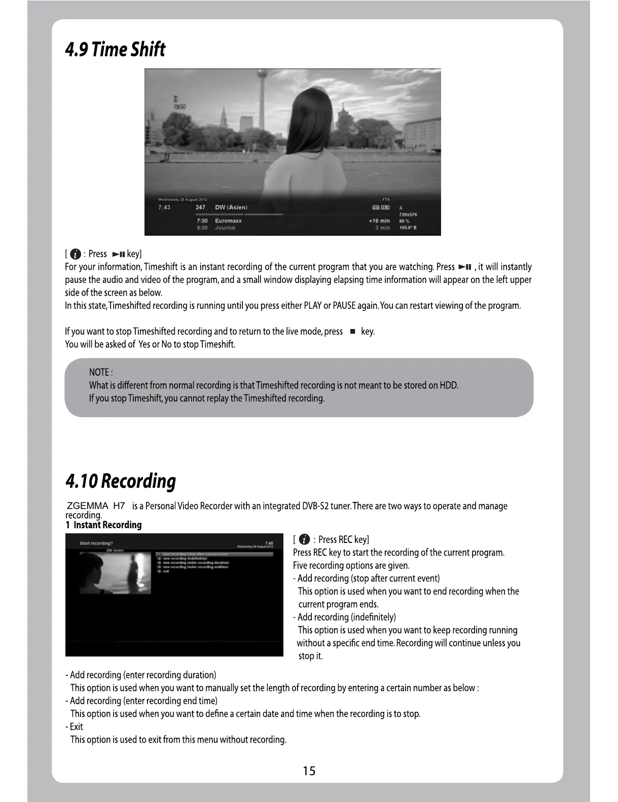 ZGEMMA H7 - 4.9 Time Shift; 4.10 Recording