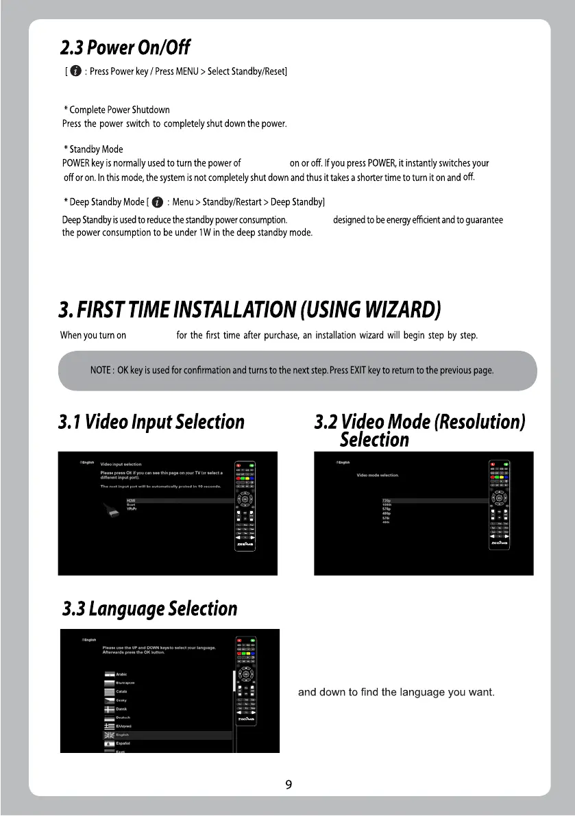 ZGEMMA H9S - First Time Installation (Using Wizard); Power On;Off; Video Input Selection; Video Mode (Resulution) Selection;Language Selection